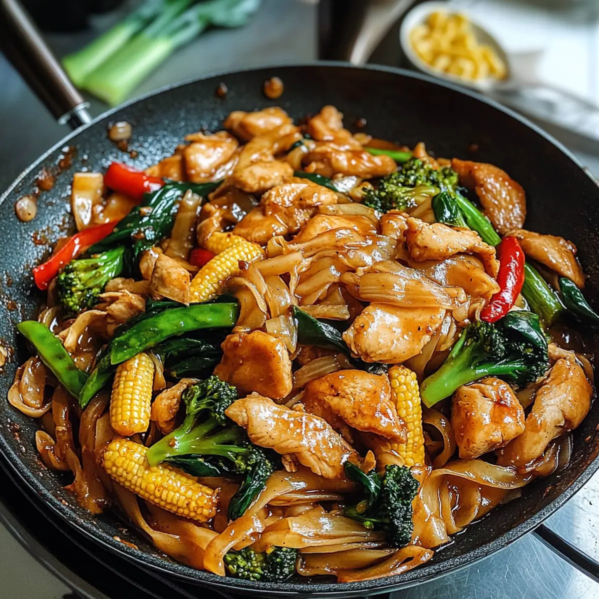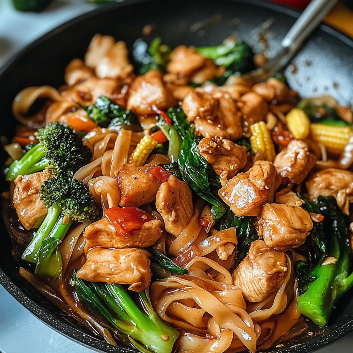 Schnelle Betrunkene Nudeln mit Gemüse und Hähnchen