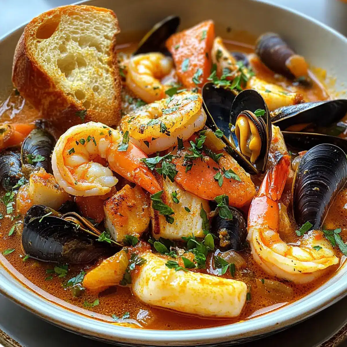 Serviere deine Bouillabaisse mit knusprigem Baguette oder Knoblauchtoast, um das Gericht zu vervollständigen und ein authentisches mediterranes Erlebnis zu bieten.