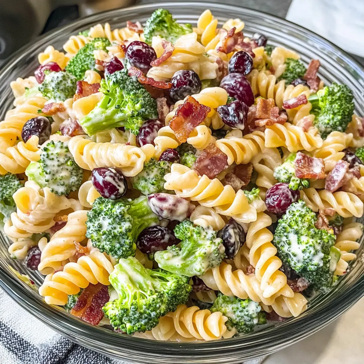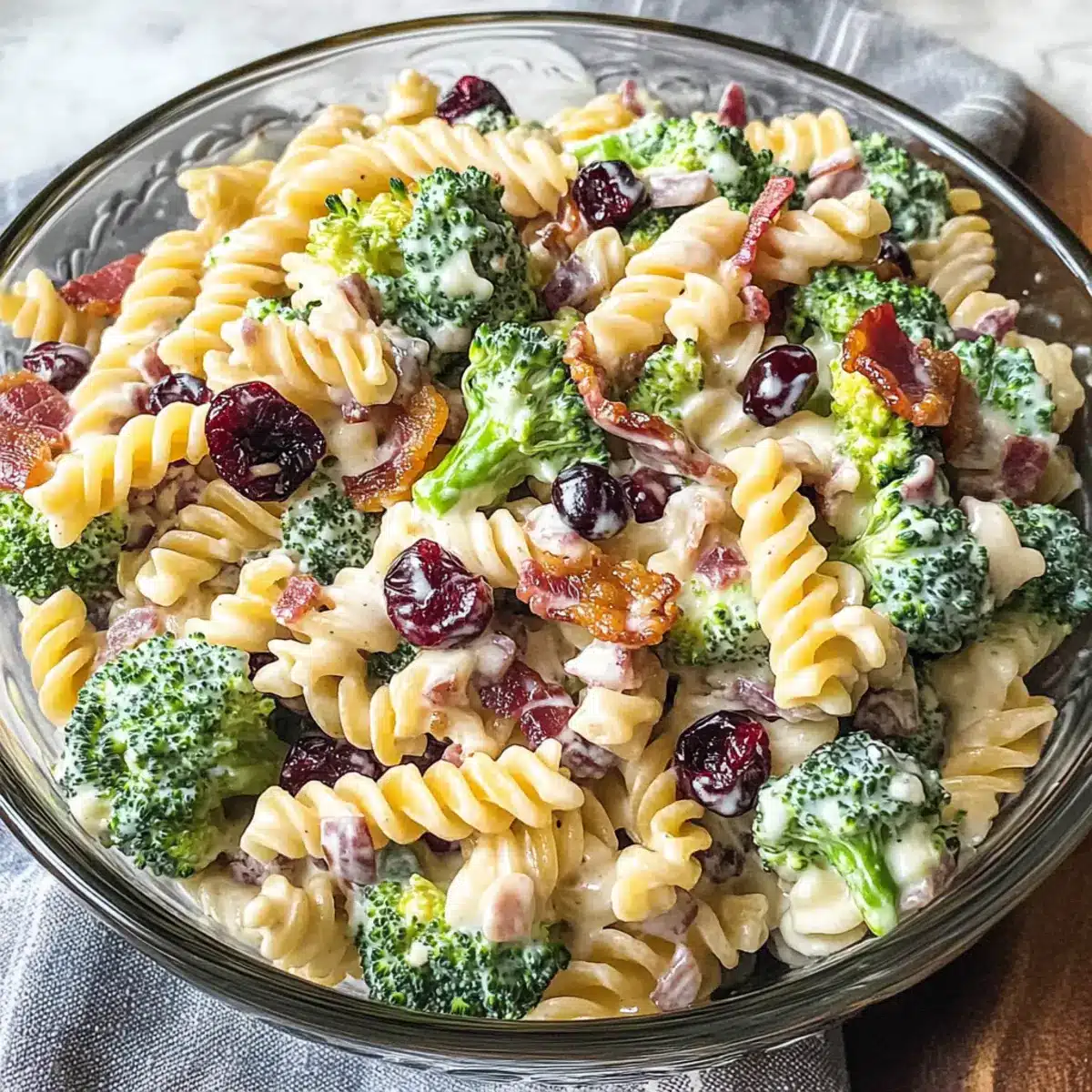 Beliebtheit garantieren: Dieser Brokkoli-Pasta-Salat wird auf jedem Potluck zum Gesprächsthema! Mach dir einfach eine große Schüssel und lass alle genießen.
