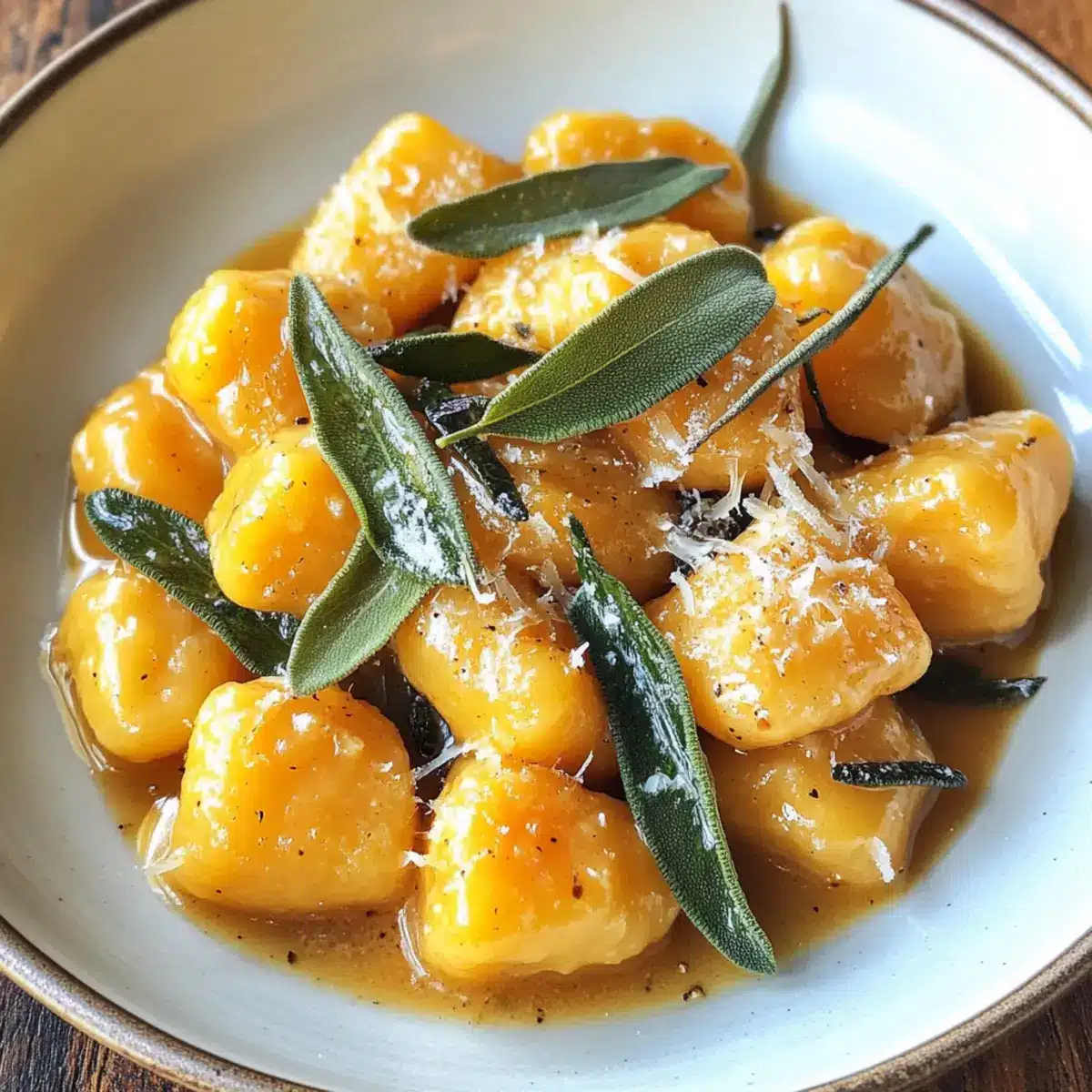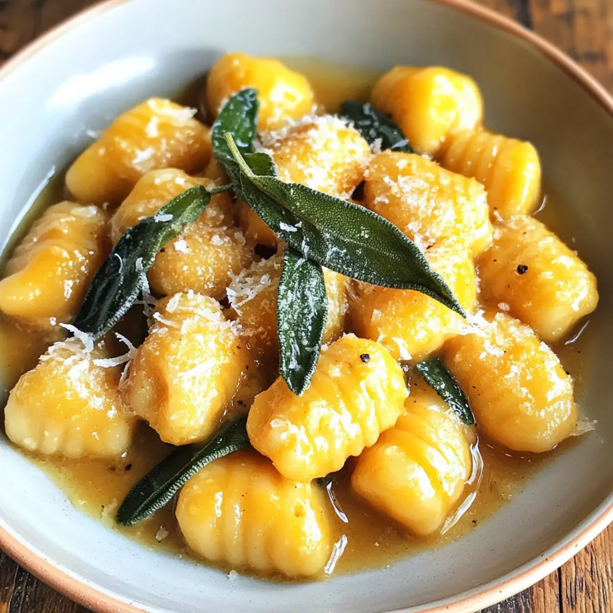 Gib die gekochten Gnocchi in die Pfanne mit der braunen Butter und dem Salbei. Lasse sie für eine zusätzliche Minute in der Pfanne schwenken, damit sie die Aromen absorbieren. Serviere die Butternut-Kürbis-Gnocchi sofort, bestreut mit geriebenem Parmesan und garnieren mit knusprigen Salbeiblättern.