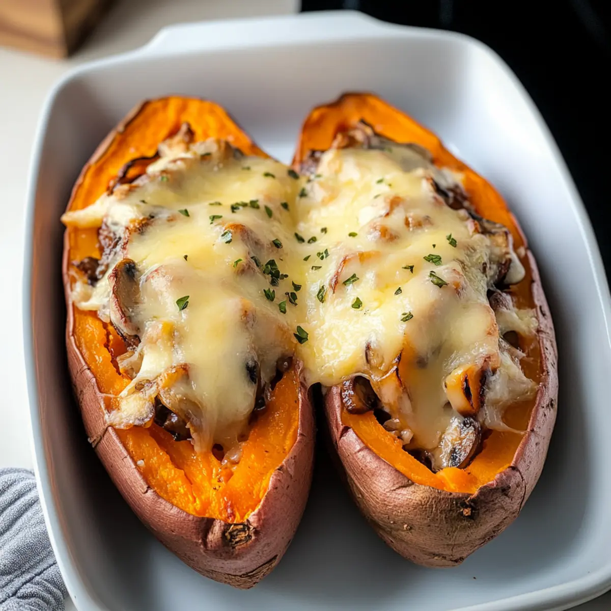 Lecker gebackene Süßkartoffel mit Pilzen und Zwiebeln