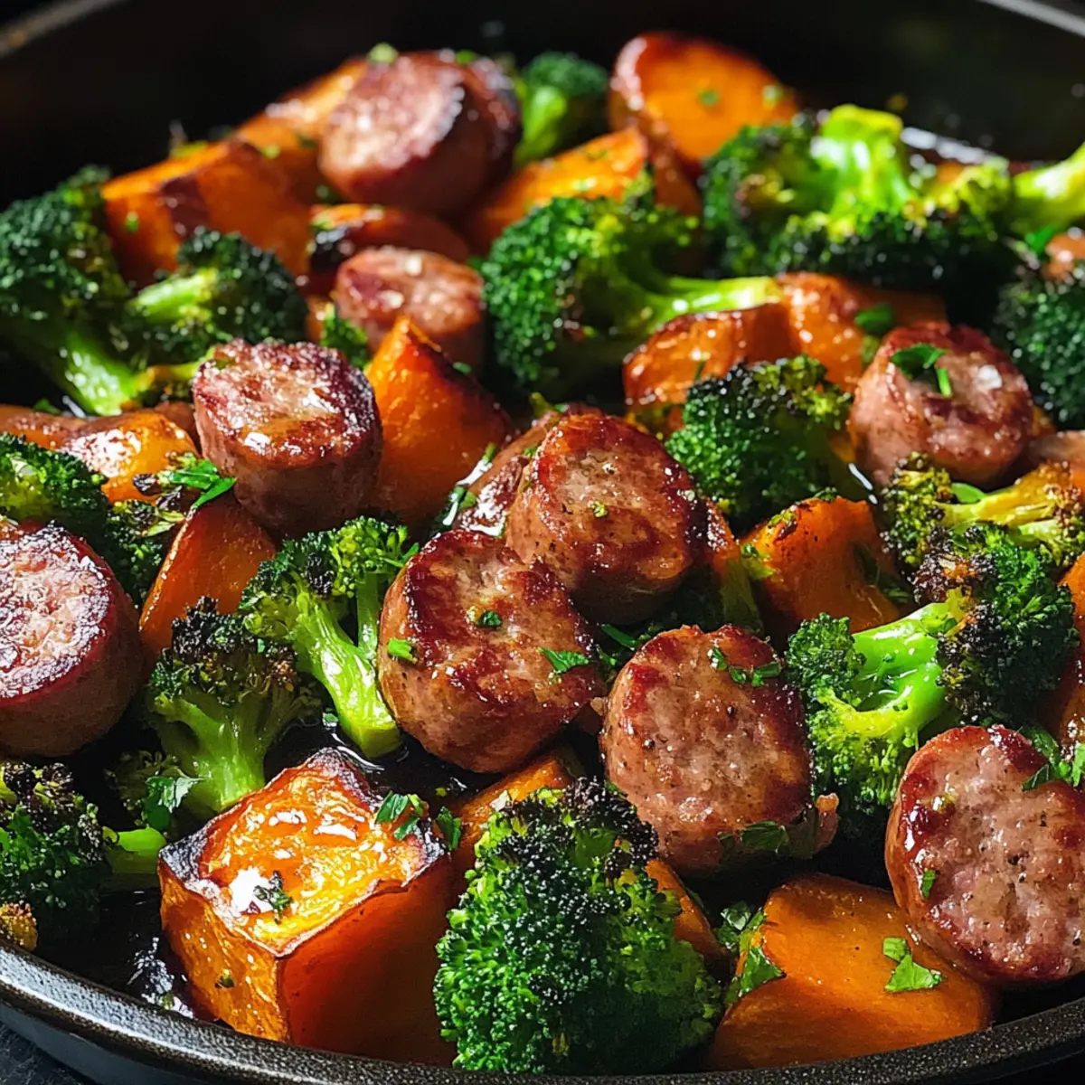 Honig Knoblauch Wurst und Süßkartoffel Blechpfanne