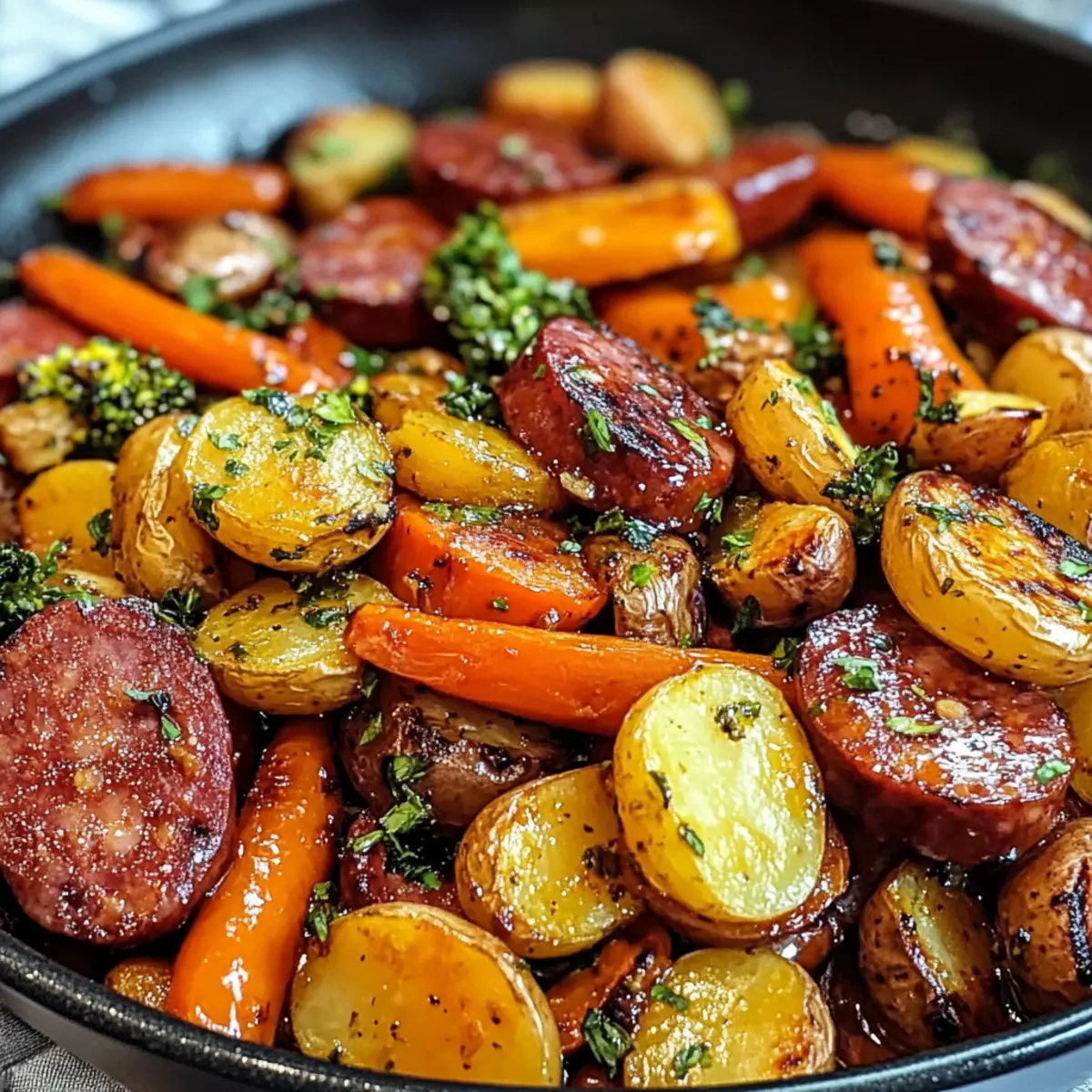 Ein-Pfannen-Honig-Knoblauch-Kielbasa & Gemüse für Familie