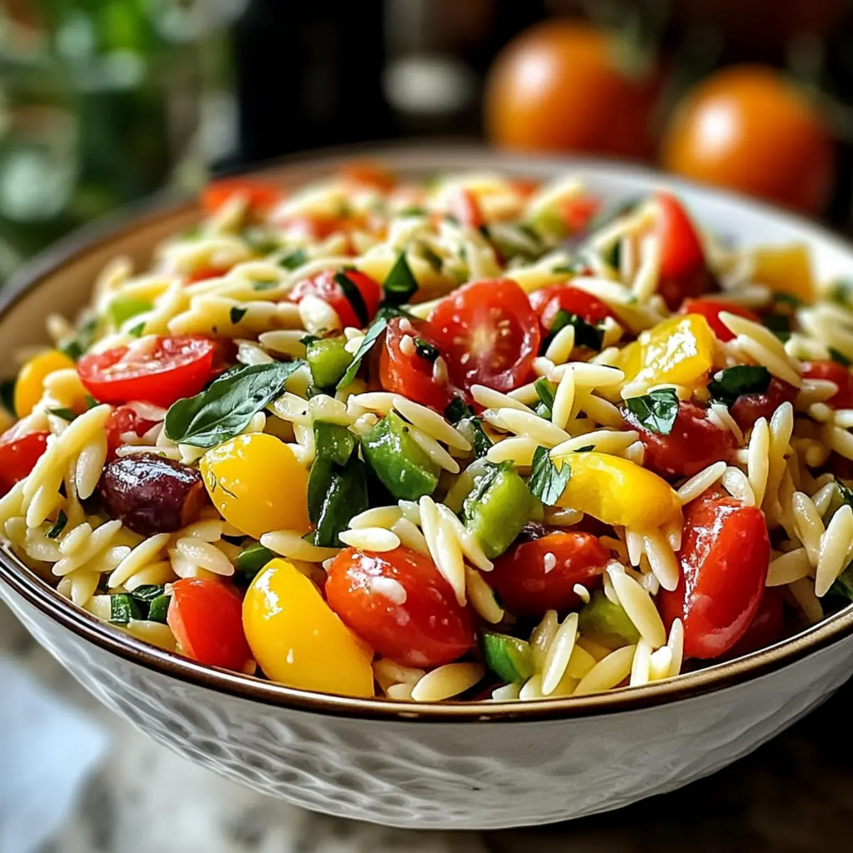 Orzo-Nudelsalat mit frischem Gemüse und Basilikum