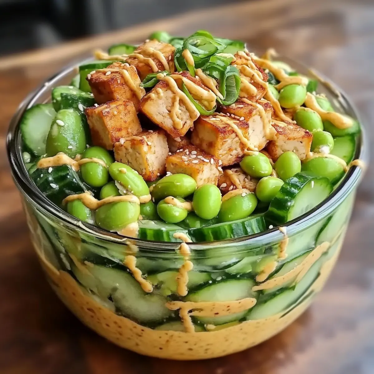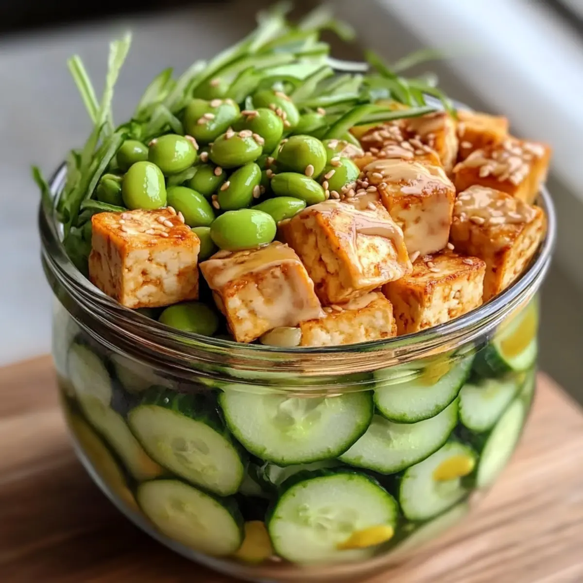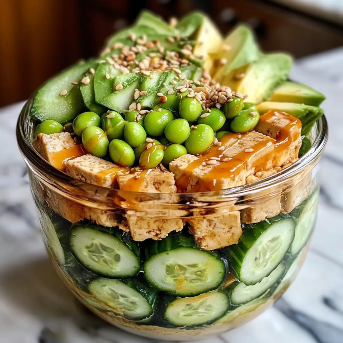 Nimm ein Glas oder eine Schüssel und beginne mit dem Schichten der Zutaten. Lege die Gurkenscheiben gleichmäßig auf den Boden, gefolgt von einer Schicht Zwiebeln, Tofu, Edamame, Karotten, Avocado und Frühlingszwiebeln. Achte darauf, dass die verschiedenen Schichten gut sichtbar sind, um eine bunte Präsentation zu erzielen.