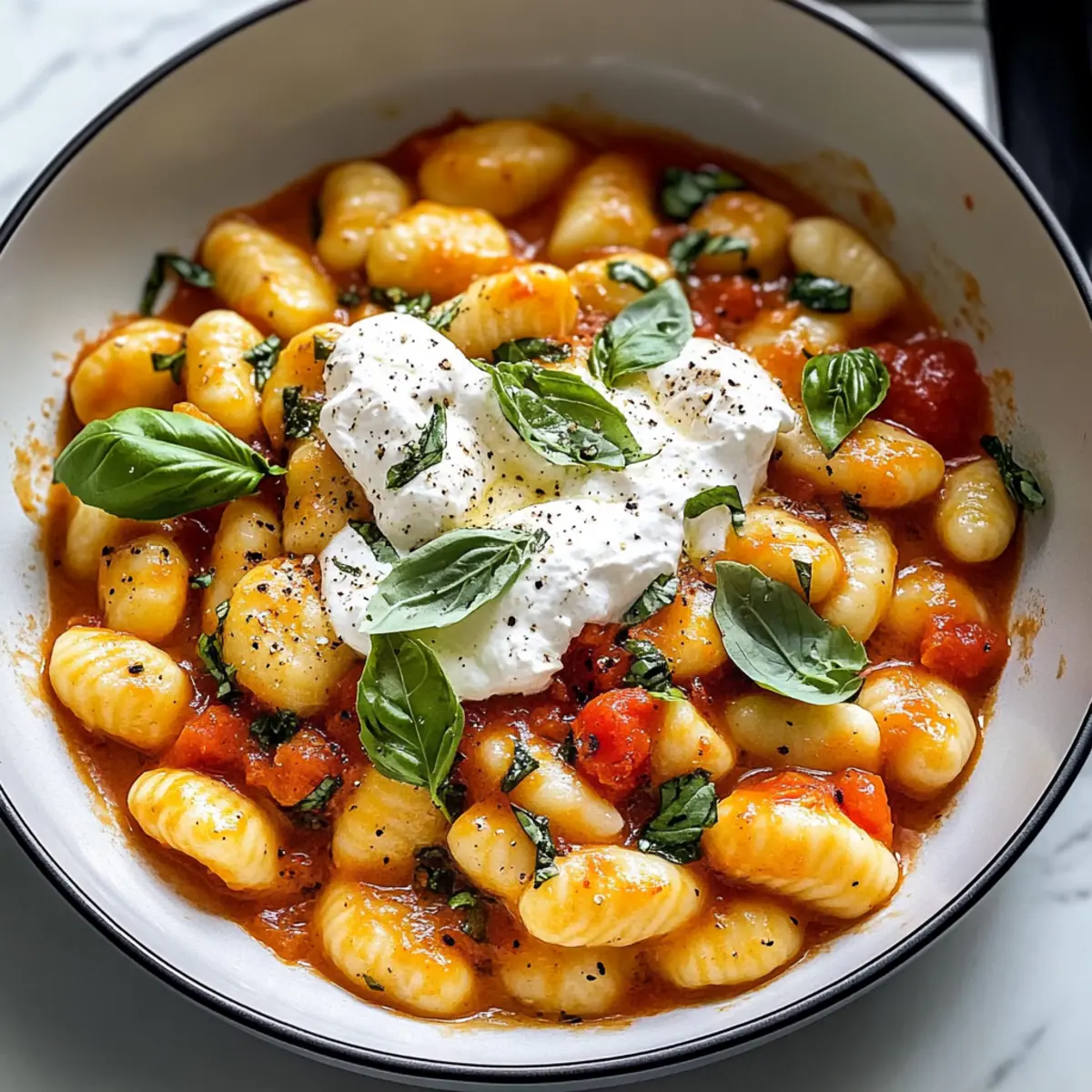 - Garnieren Sie die cremigen Tomaten-Gnocchi mit den reservierten Basilikumblättern und servieren Sie sofort.