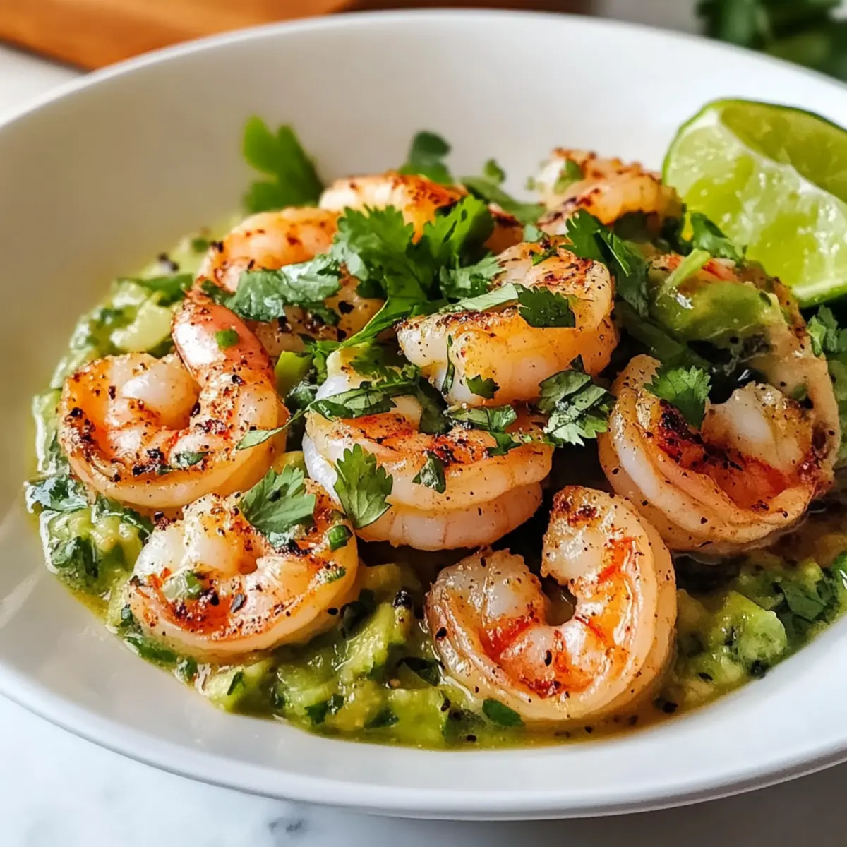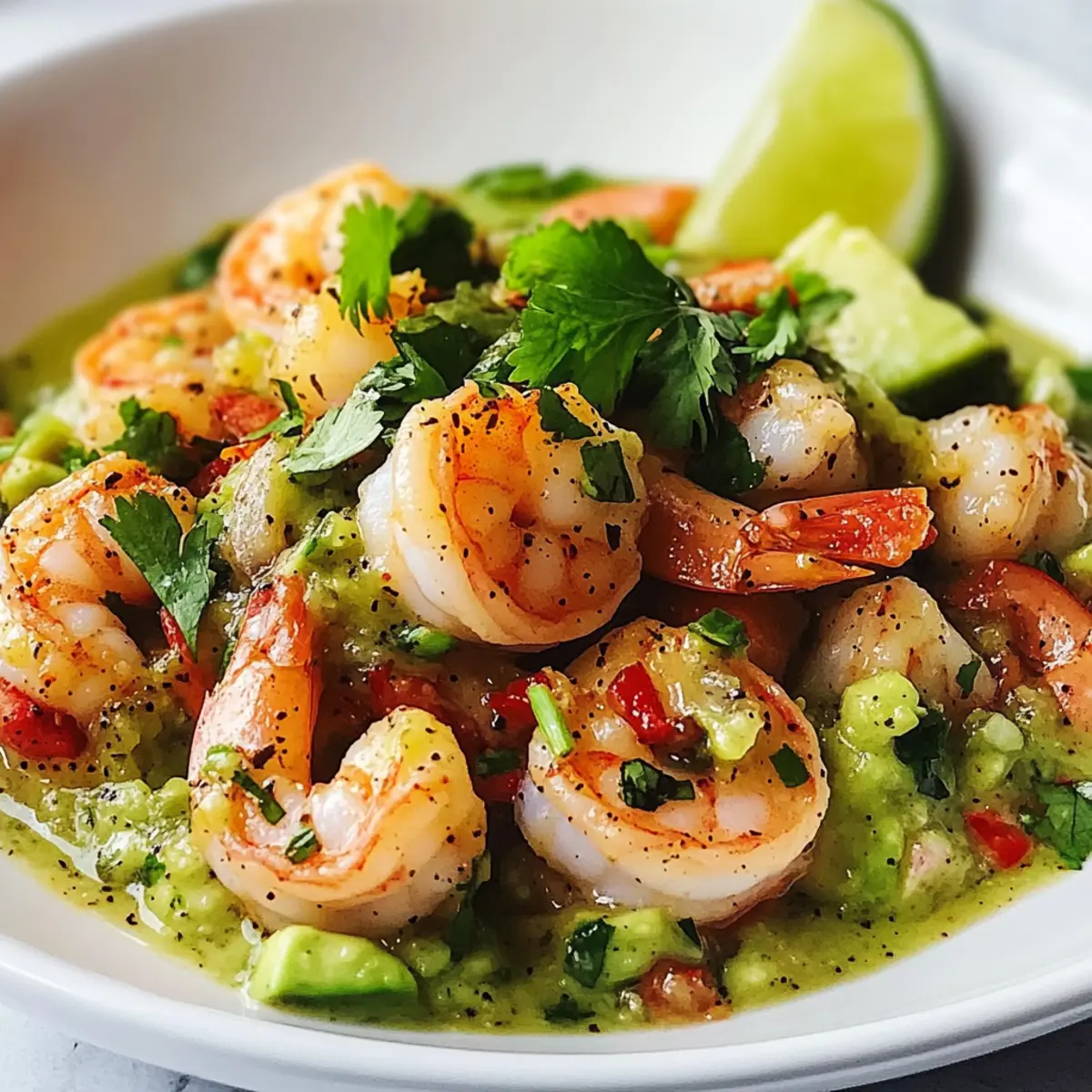 Beeindruckende Präsentation: Die strahlend grüne Salsa und die zarten Garnelen machen dieses Gericht zu einem echten Hingucker auf jedem Tisch.