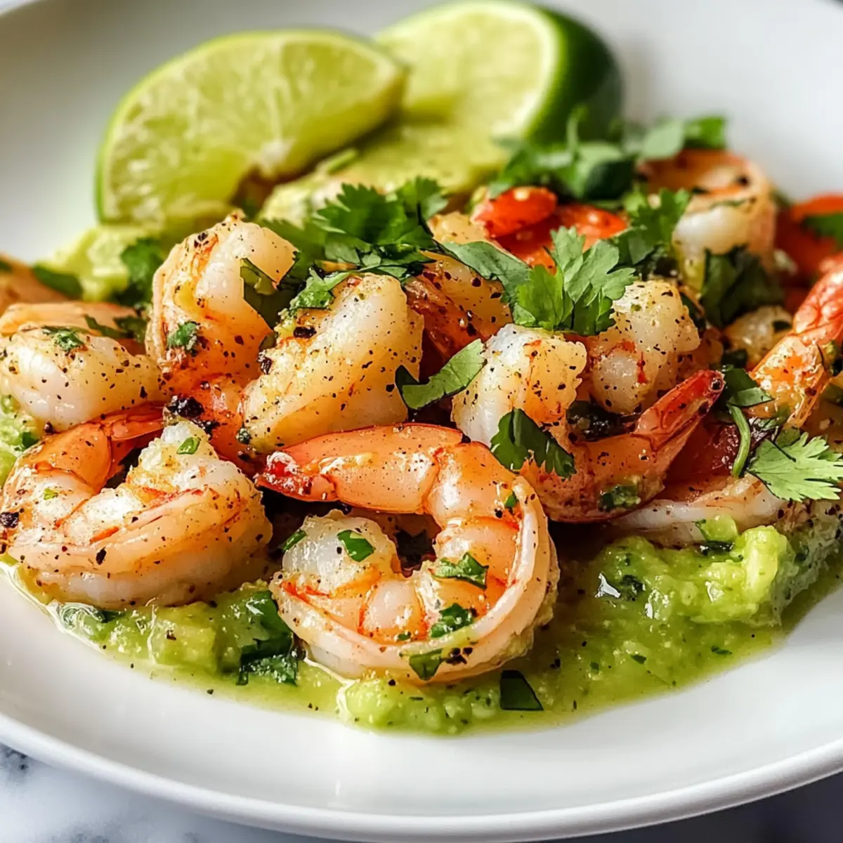 - Serviere die grüne Salsa in Schalen und platziere die gebratenen Garnelen darauf. Mit Limettenvierteln und Koriander garnieren.