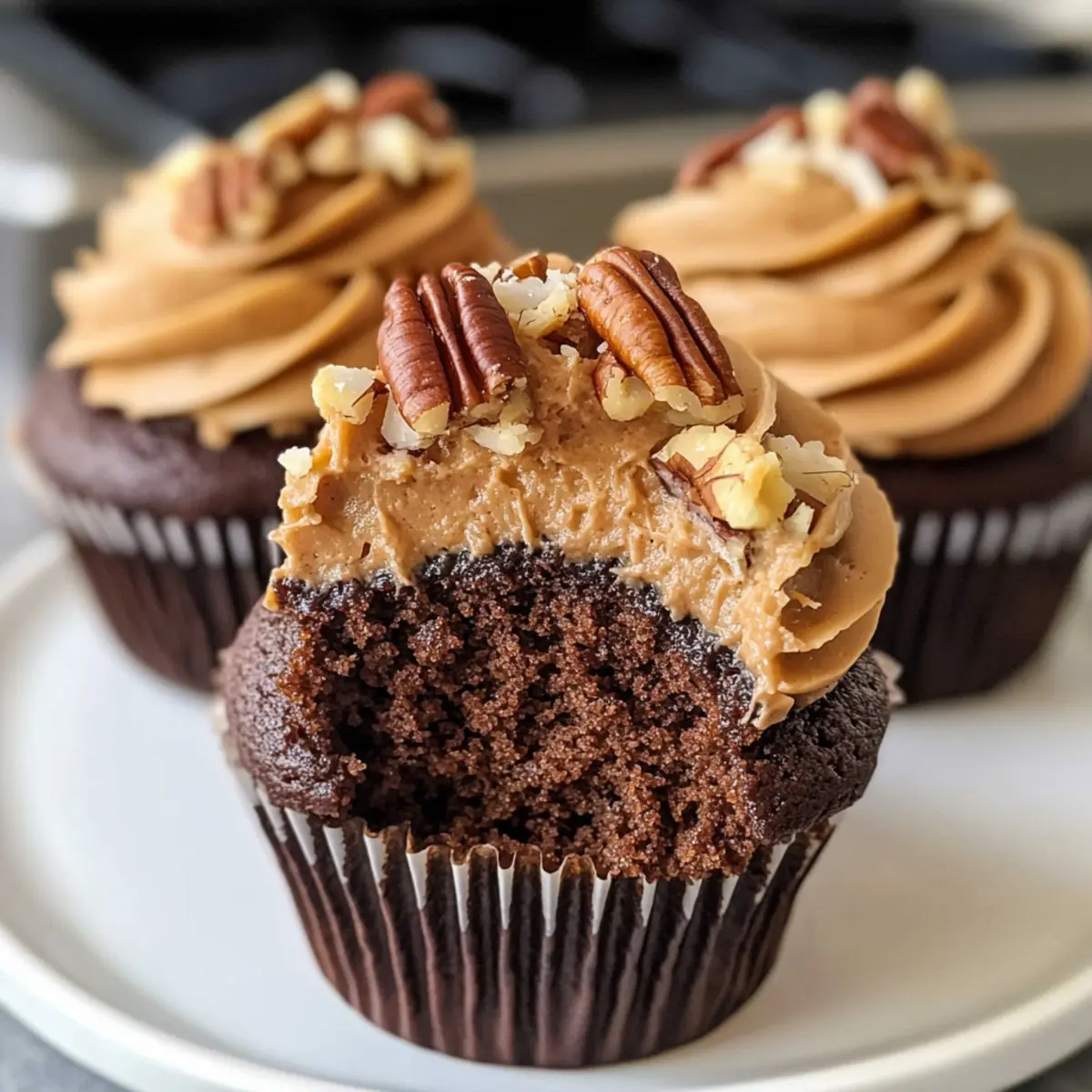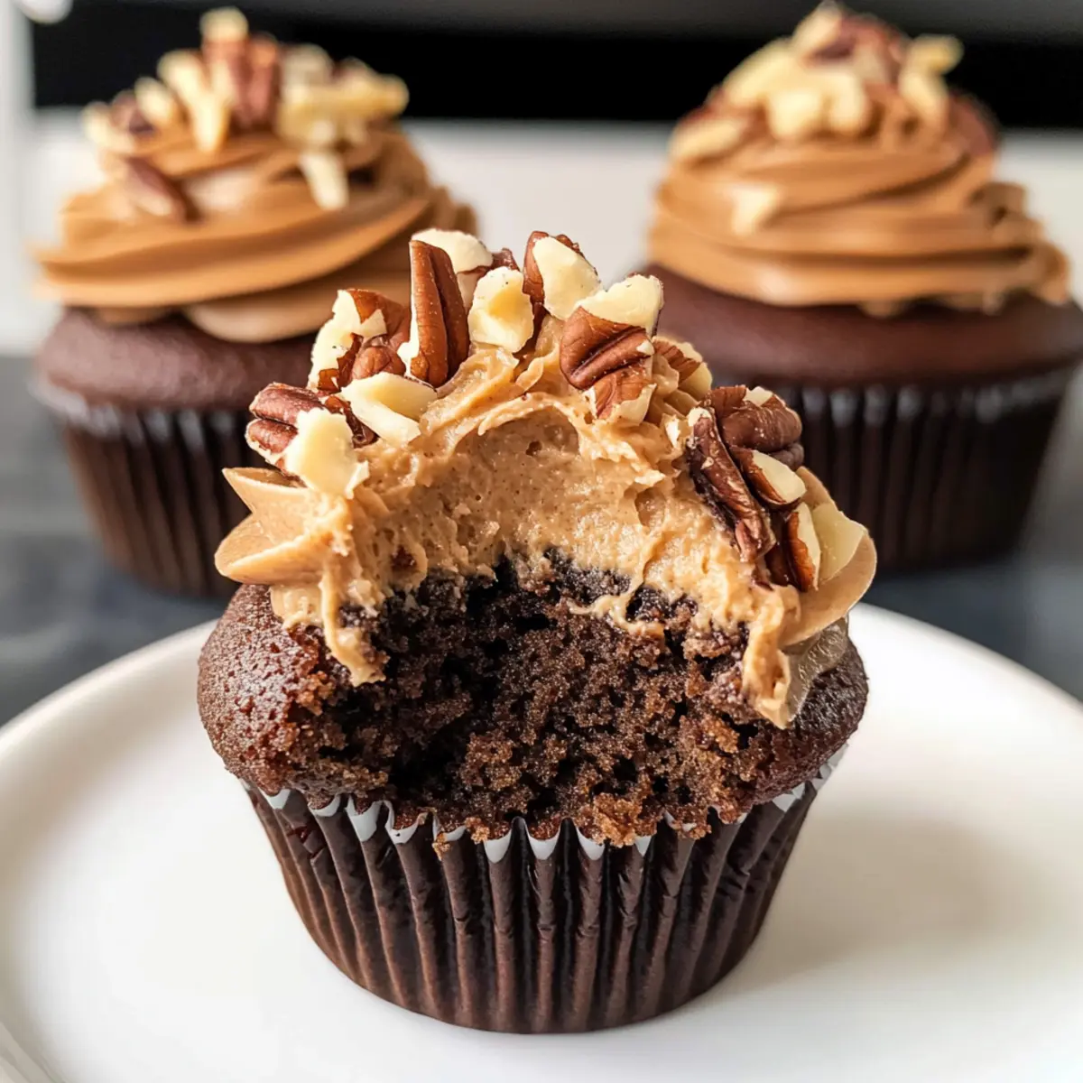 Verteile zuerst die Pecan-Kokosglasur großzügig auf jedem Cupcake. Danach spritze die Schokoladenbuttercreme auf die Glasur. Garniere mit gehackten Pecannüssen, um zusätzlichen Crunch und Geschmack hinzuzufügen. Deine deutschen Schokoladen-Cupcakes sind nun bereit zum Genießen!