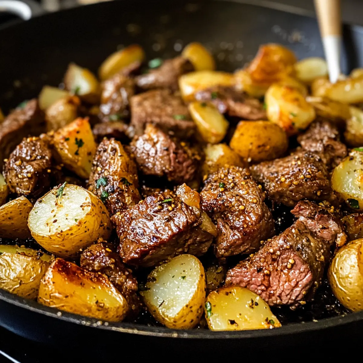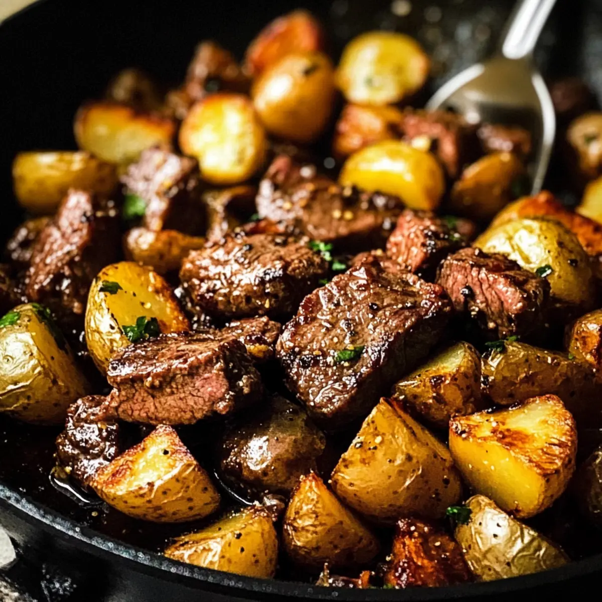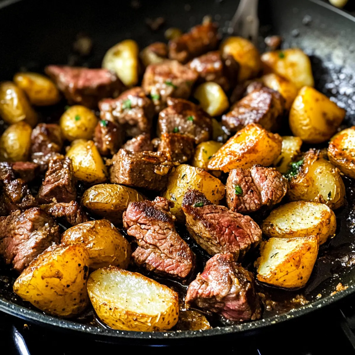 Eine Pfanne Rauchiges Steak und Kartoffeln für Eilige
