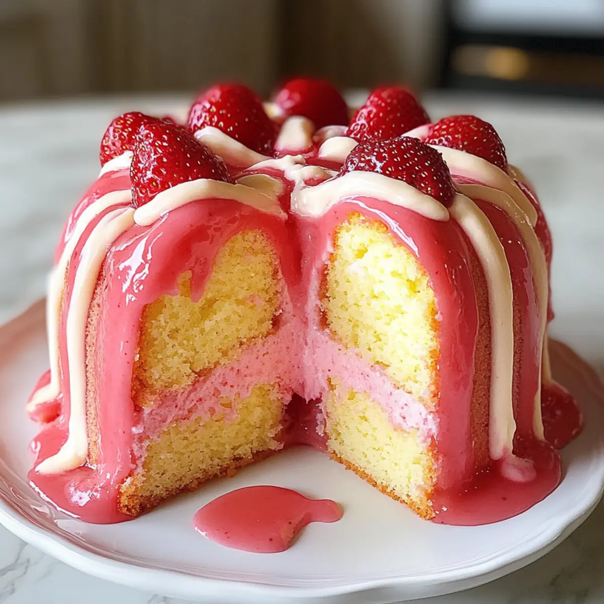 Für die Glasur vermische Puderzucker, Erdbeer-Milch, Vanille und eine Prise Salz in einer Schüssel. Rühre, bis die Mischung eine glatte, gießfähige Konsistenz hat. Gieße die Glasur über den abgekühlten Kuchen und lass sie ein wenig fest werden, bevor du ihn servierst.