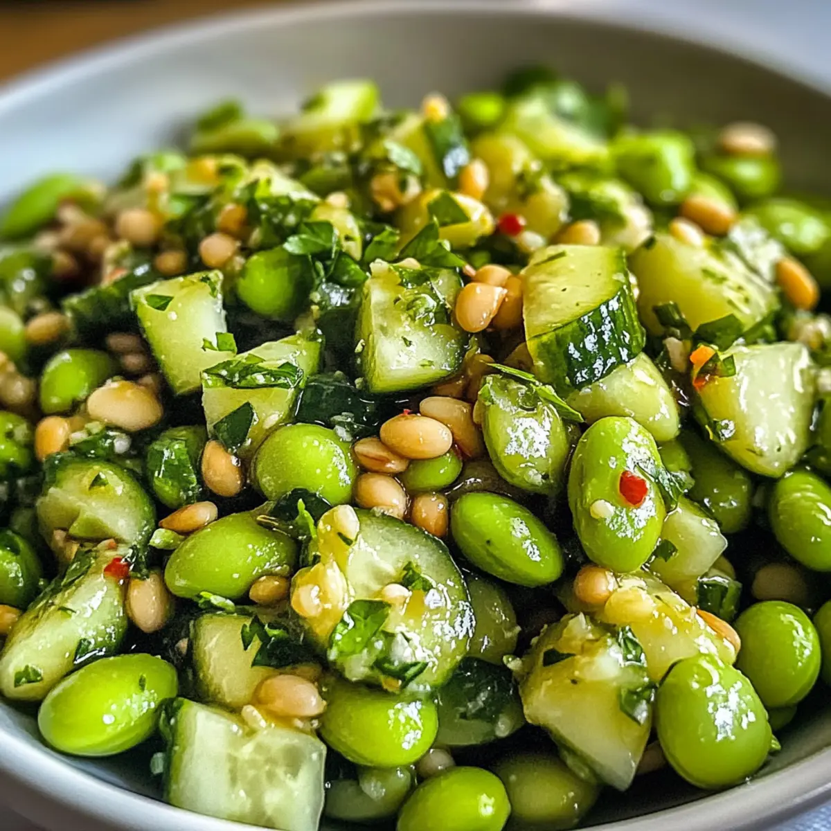 Frische: Der Gurken Edamame Salat ist eine wahre Freude für die Sinne. Die knackigen Gurken und das nussige Edamame sorgen für eine erfrischende Kombination, die deinem Gaumen schmeichelt. Schnelle Zubereitung: In nur 10 Minuten hast du eine gesunde Beilage gezaubert, die perfekt für spontane Grillfeiern oder ein leichtes Mittagessen geeignet ist. Vielseitigkeit: Du kannst mit verschiedenen Variationen spielen, indem du zum Beispiel frische Kräuter wie Dill oder Minze hinzufügst. Eine leichte, vegane Option: Diese Rezeptur ist nicht nur vegan, sondern auch glutenfrei und passt ins gesunde Lebenskonzept. Wenn du auf der Suche nach einer kreativen Eigenkreation bist, lass dich von unseren Variationen inspirieren!