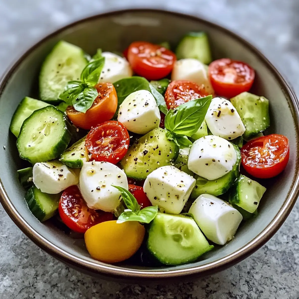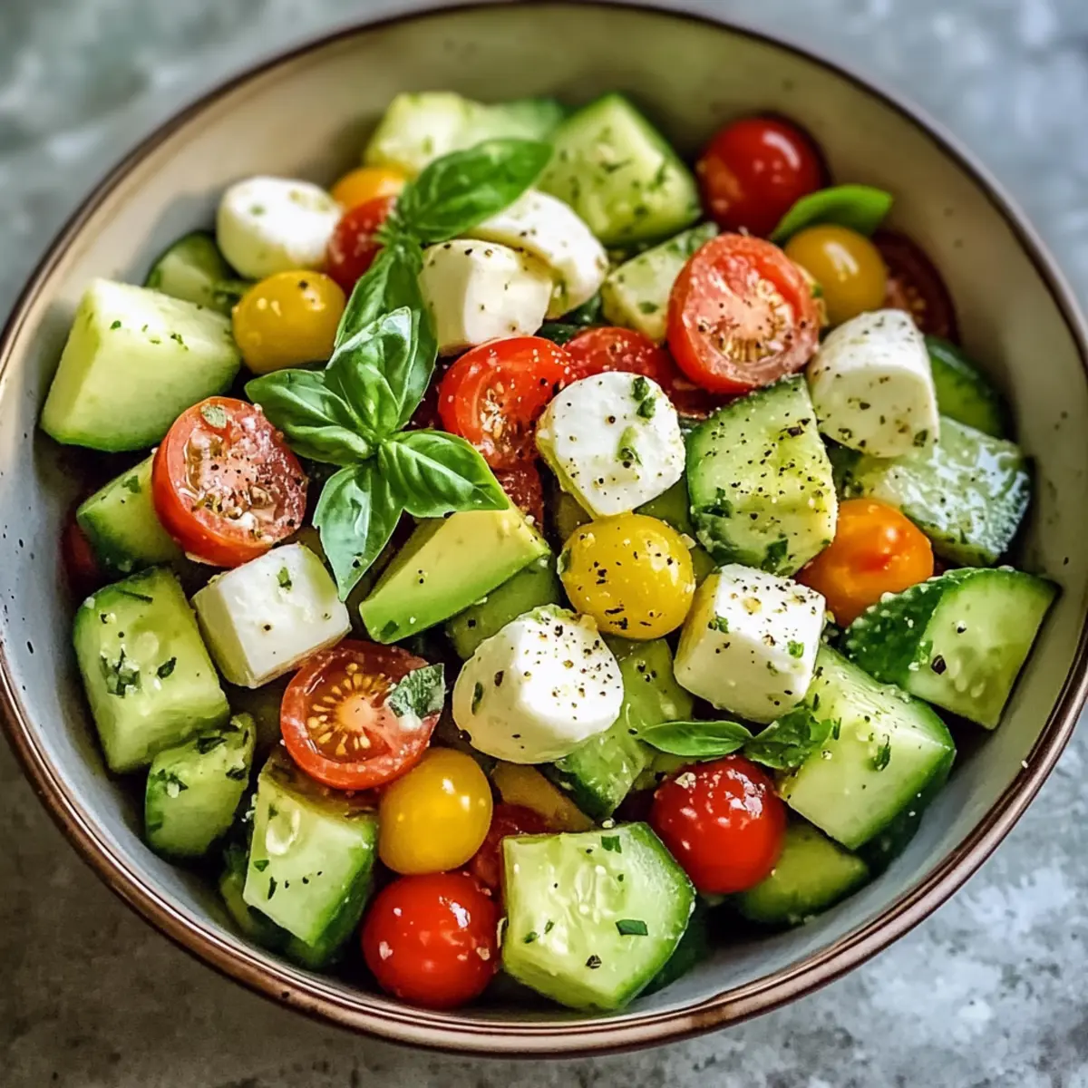 Wiedervorbereitung:: Um den Salat wieder frisch zu genießen, mische die Zutaten gut durch und gib bei Bedarf eine Prise frischer Vinaigrette hinzu. Dies belebt den Geschmack des Gurken-Mozzarella-Salats mit Avocado.