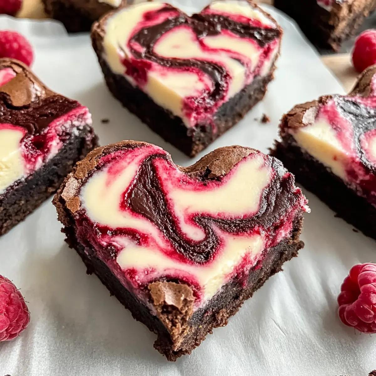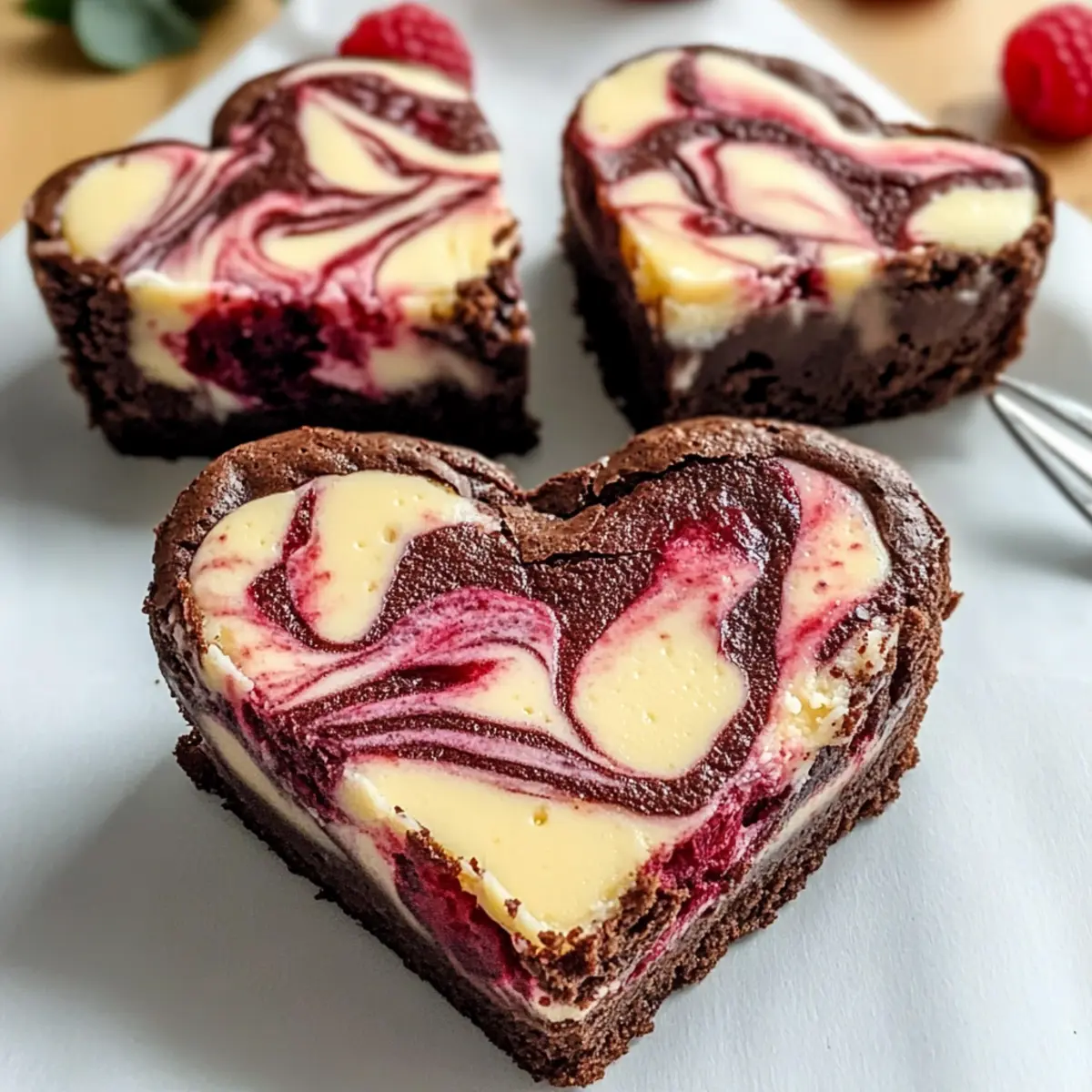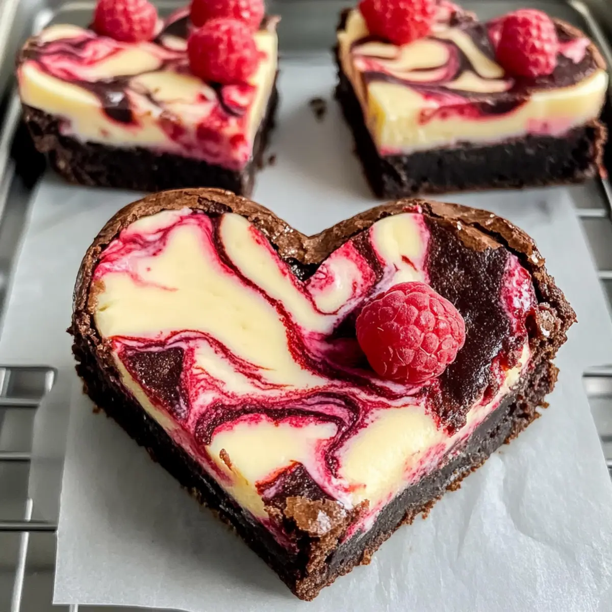 Einzigartiger Genuss: Diese herzförmigen Brownies kombinieren eine fudgy Schokoladenbasis mit einer köstlichen Cheesecake-Schicht und einem fruchtigen Himbeerswirl, was sie besonders macht.