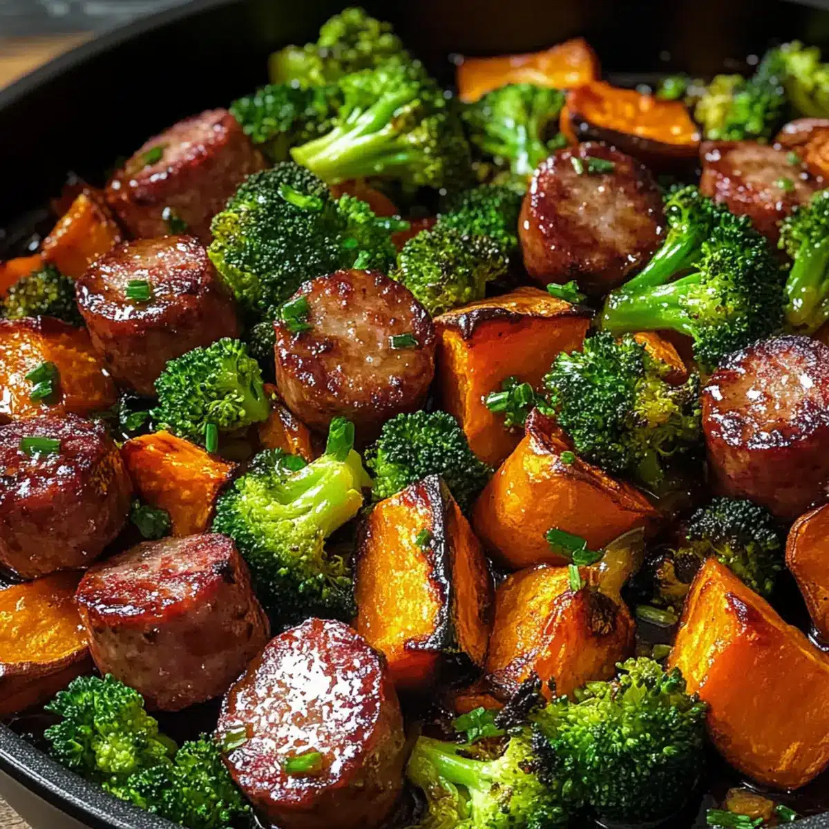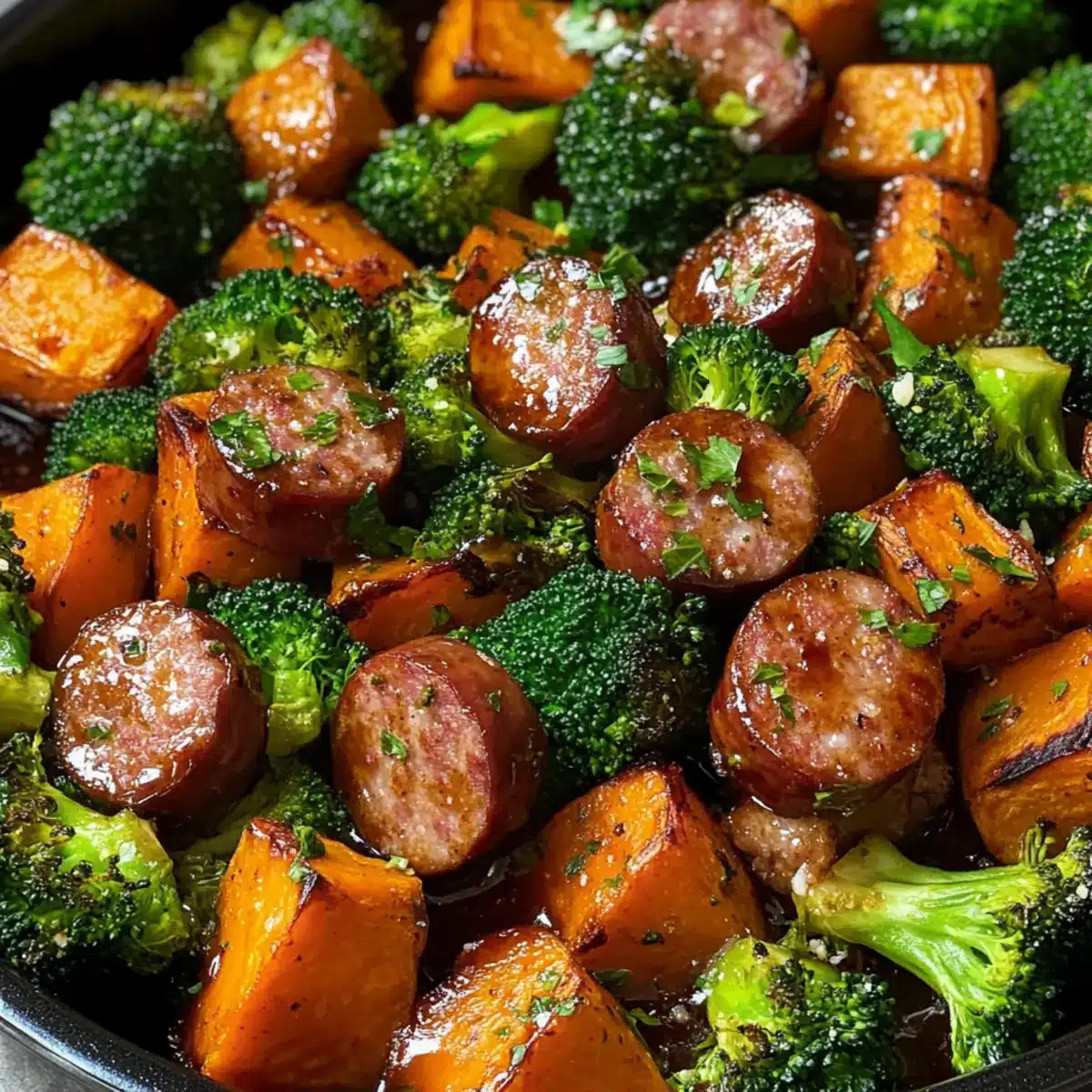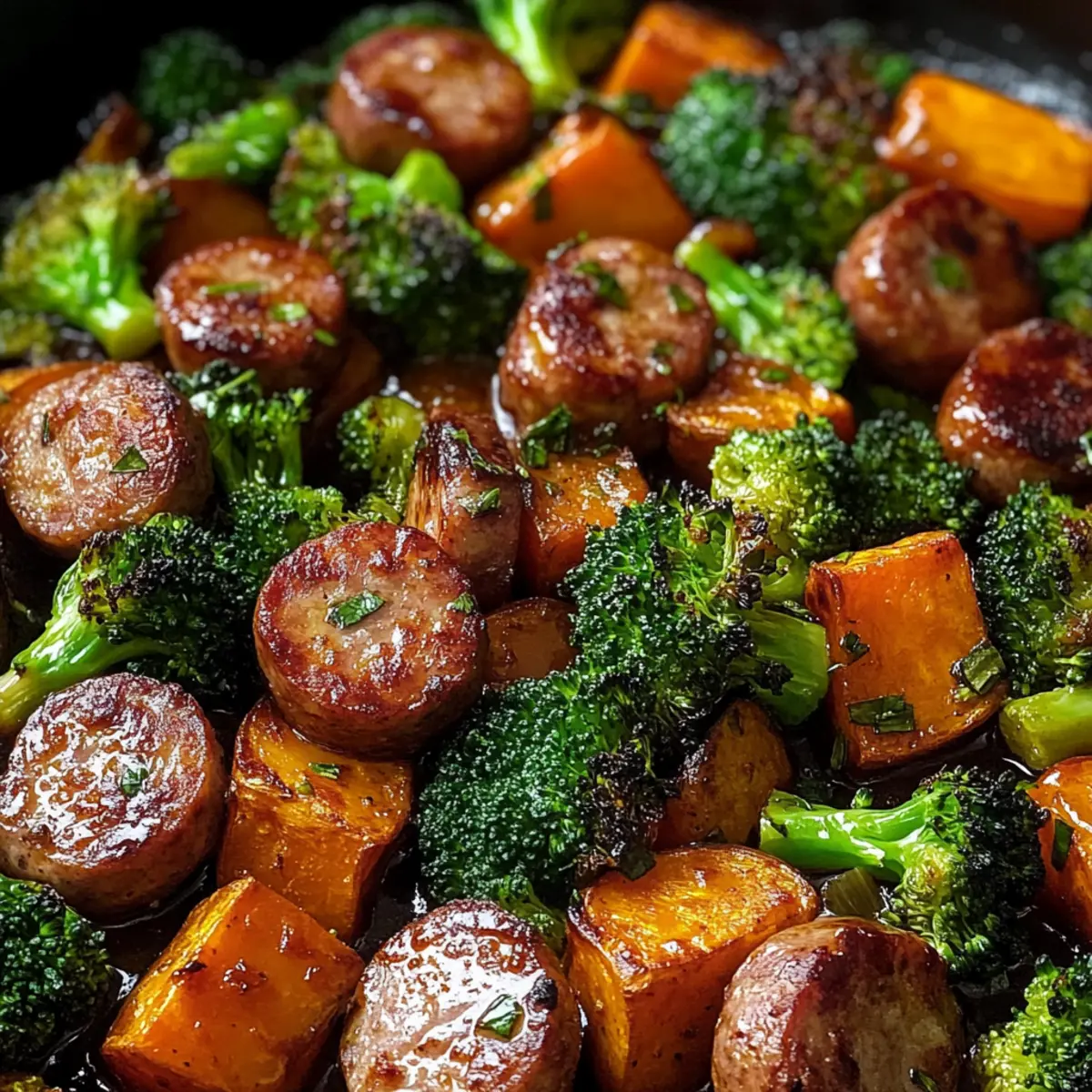 Honig Knoblauch Wurst und Süßkartoffel Blechpfanne