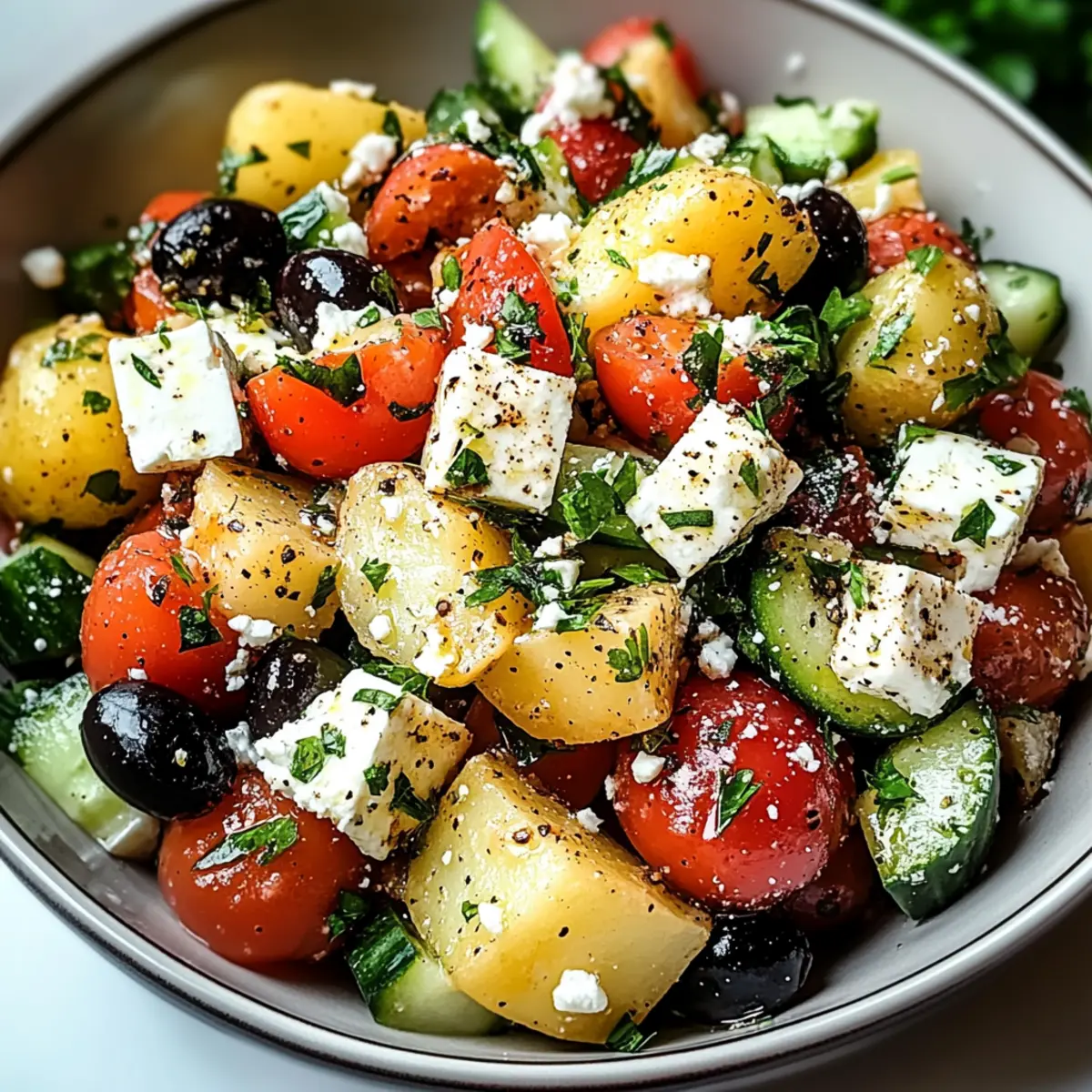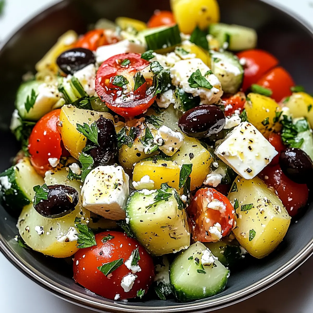 - Zutaten kombinieren: Gewürfelte Kartoffeln mit Petersilie, Zwiebel, Gurke, Tomaten, Oliven und Feta in einer Schüssel vermengen.