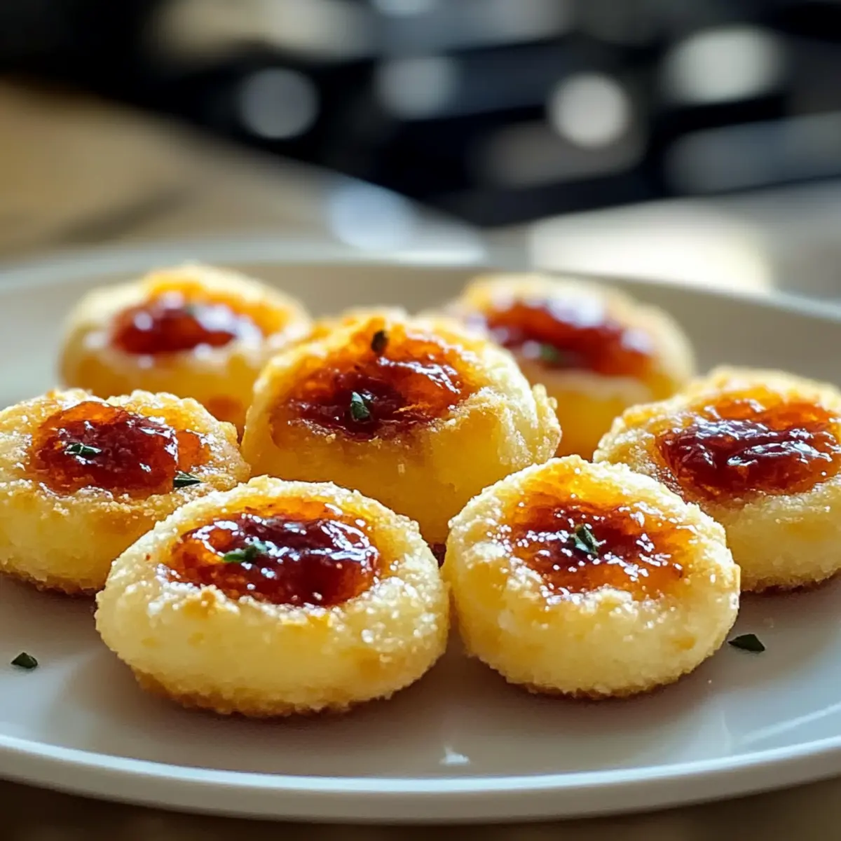 Nimm das Backblech aus dem Ofen und lasse die Käse-Daumenabdruck-Vorspeisen für einige Minuten abkühlen. Sie sollten warm serviert werden, um die geschmolzene Käsefülle und die klebrige Gelée-Textur optimal zur Geltung zu bringen. Genieße diese köstlichen Häppchen als perfekten Snack für deine nächste Feier oder einfach zum Schlemmen zu Hause!