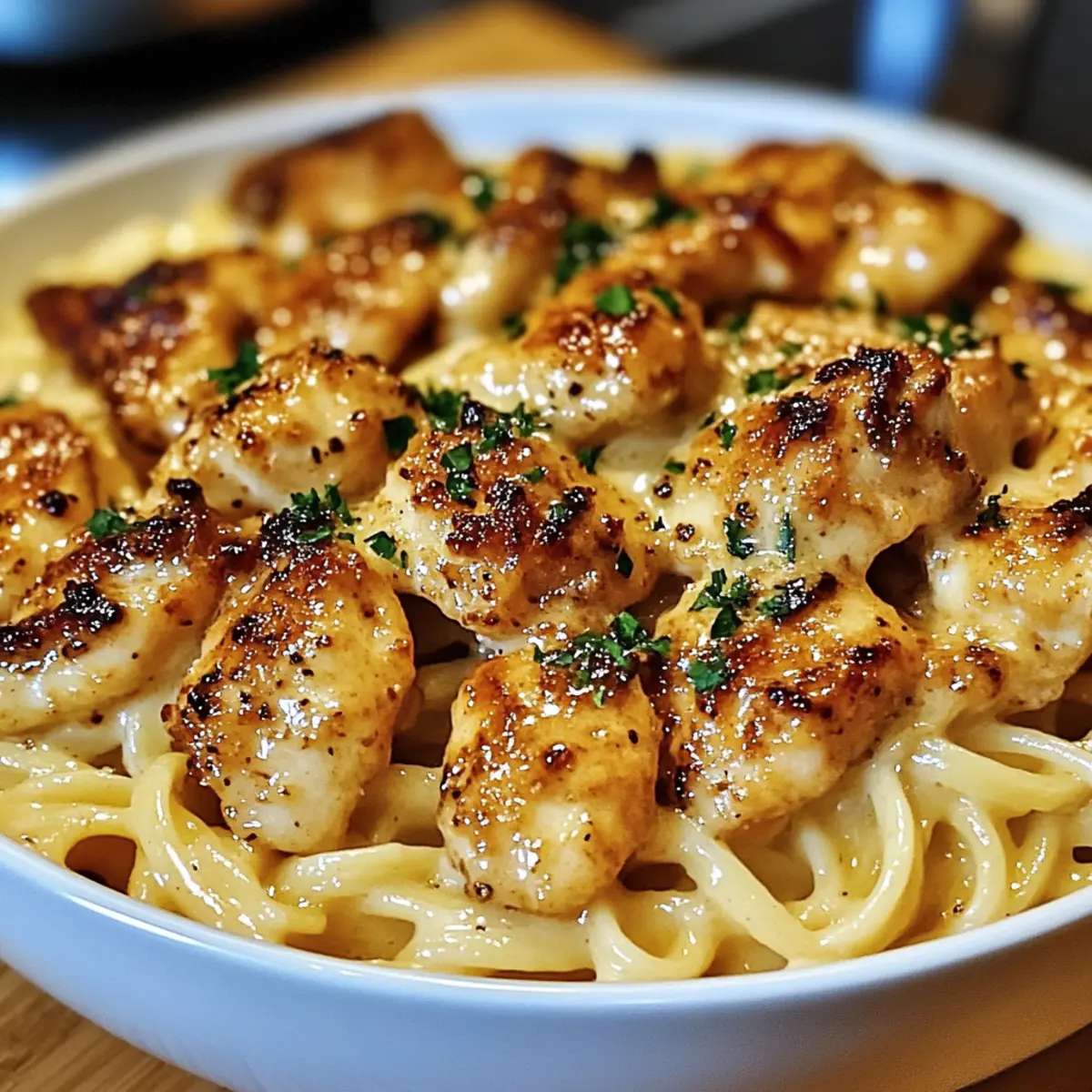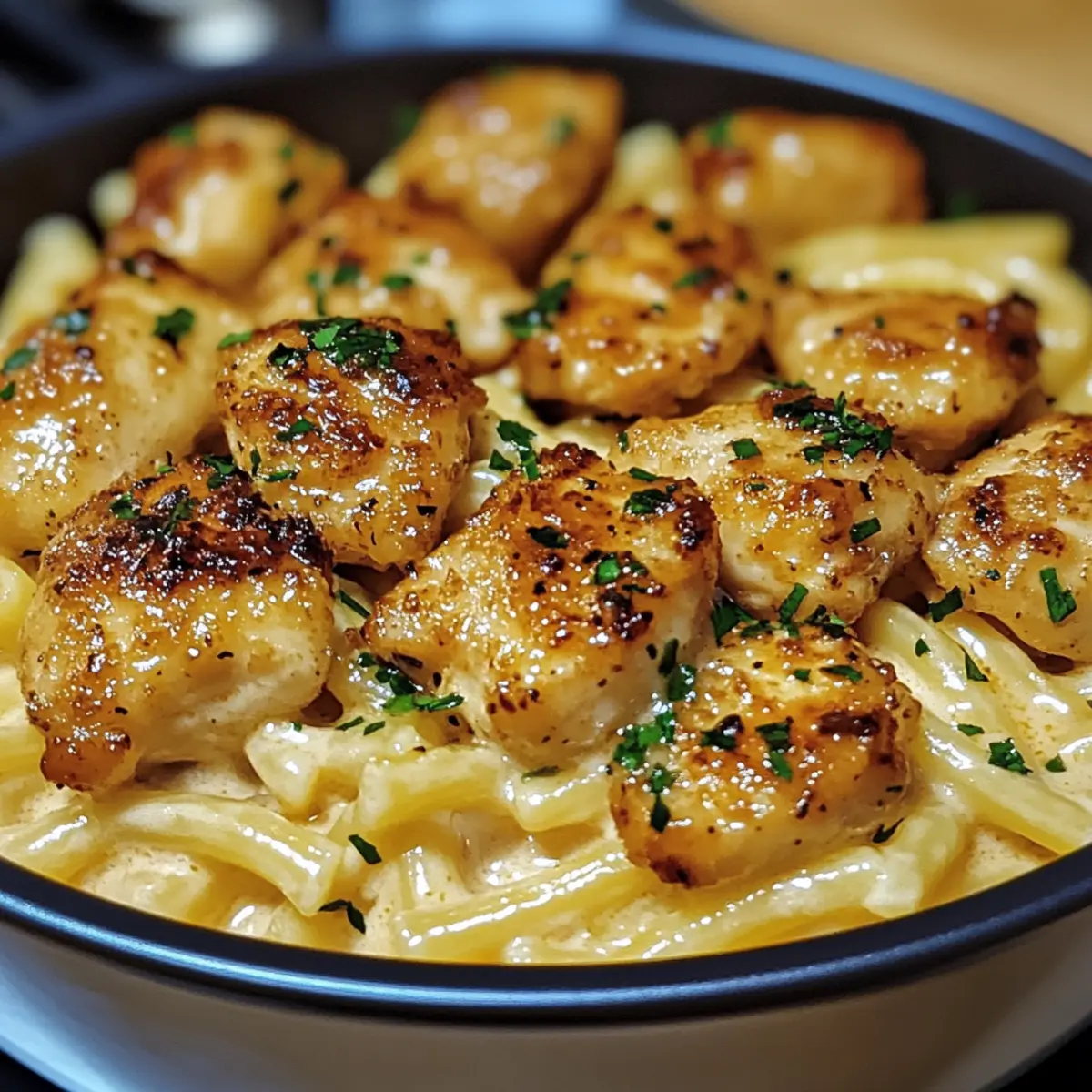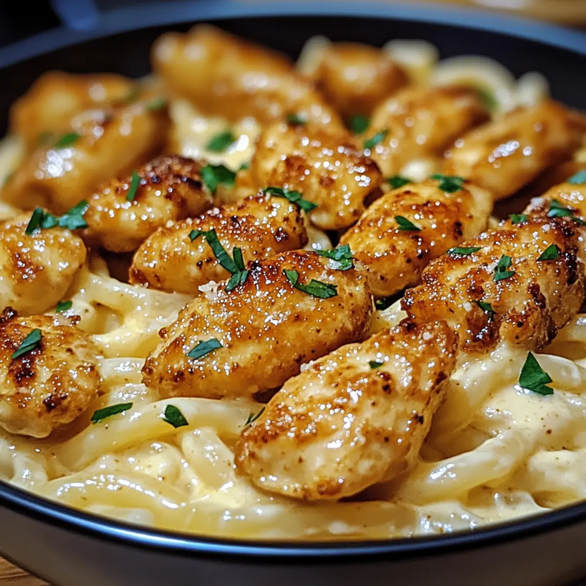 Perfekte Konsistenz: Die Kombination aus saftigem Hühnchen und cremiger Pasta macht jedes Biss zu einem Genuss. Probiere auch unsere Tipps für tolle Beilagen wie Knoblauchbrot oder einen frischen Salat, um das Gericht abzurunden!