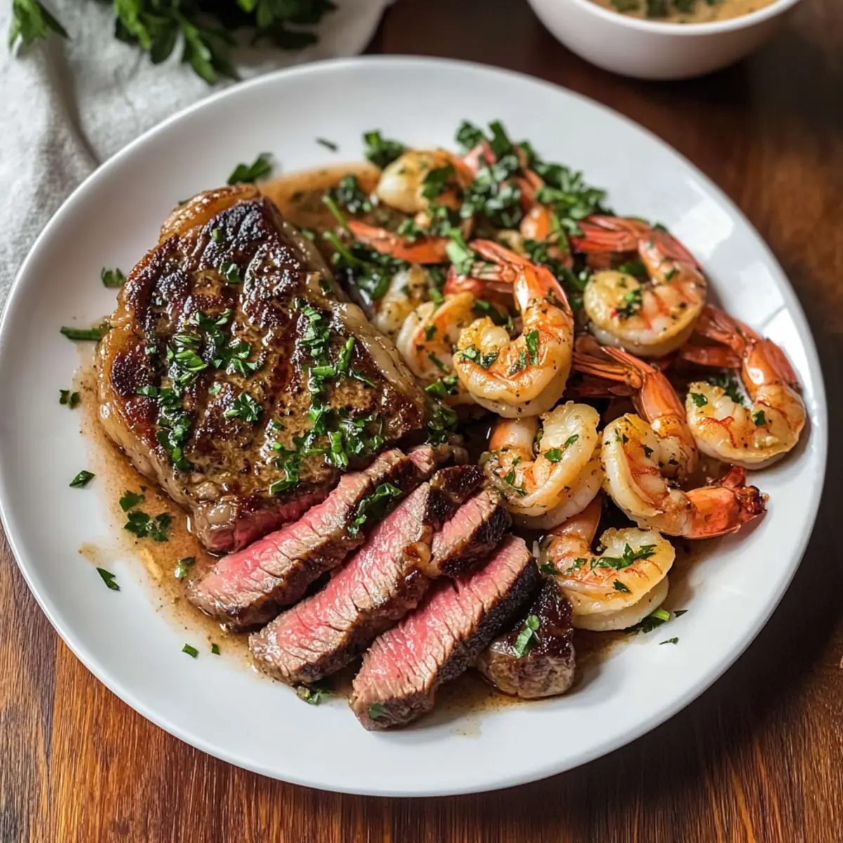 Reiche Aromen: Die Kombination aus zartem Ribeye-Steak und saftigen Garnelen, umhüllt von aromatischer Knoblauchbutter, sorgt für ein Geschmackserlebnis der Extraklasse.