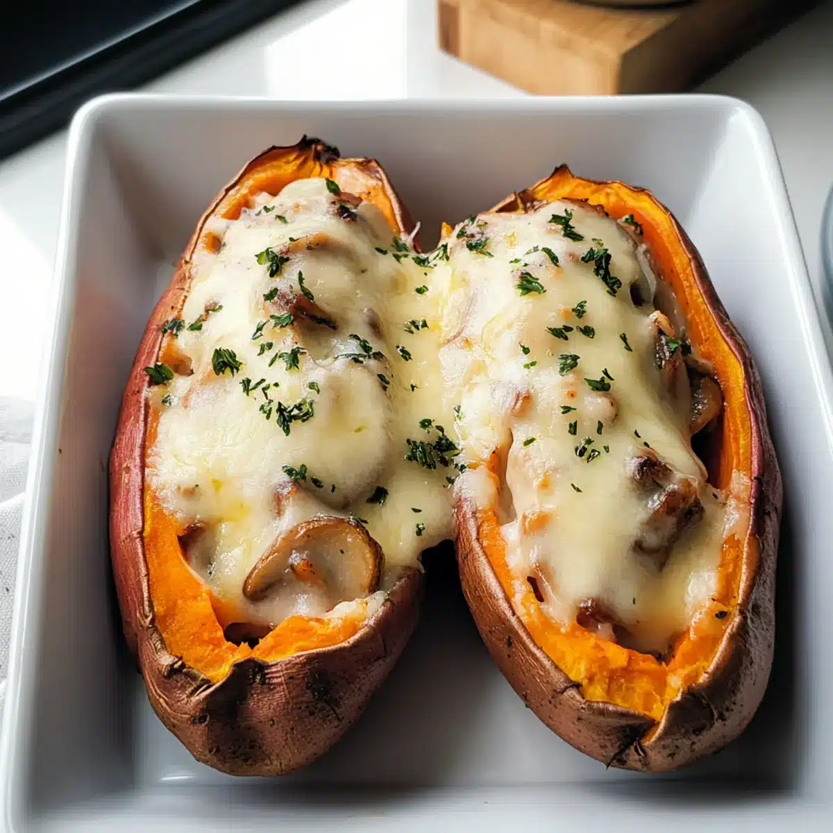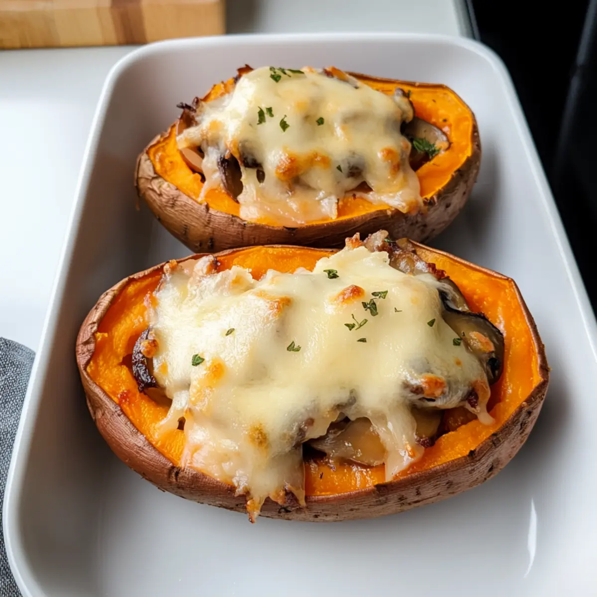 Einfachheit, denn das Rezept ist unkompliziert und erfordert nur grundlegende Kochfähigkeiten – perfekt für jeden Hobbykoch! Herzhaft, die Kombination aus Zwiebeln und Pilzen bringt einen vollen, würzigen Geschmack auf den Teller. Vielseitig, du kannst die Füllung ganz nach deinem Geschmack anpassen – probiere beispielsweise verschiedene Gemüsesorten oder füge Gewürze hinzu. Gesund, die leckeren Süßkartoffeln sind reich an Vitaminen, Ballaststoffen und haben wenig Kalorien. Schnell zubereitet, nach nur etwa einer Stunde hast du ein nahrhaftes Gericht, das ideal für ein schnelles Abendessen ist!
