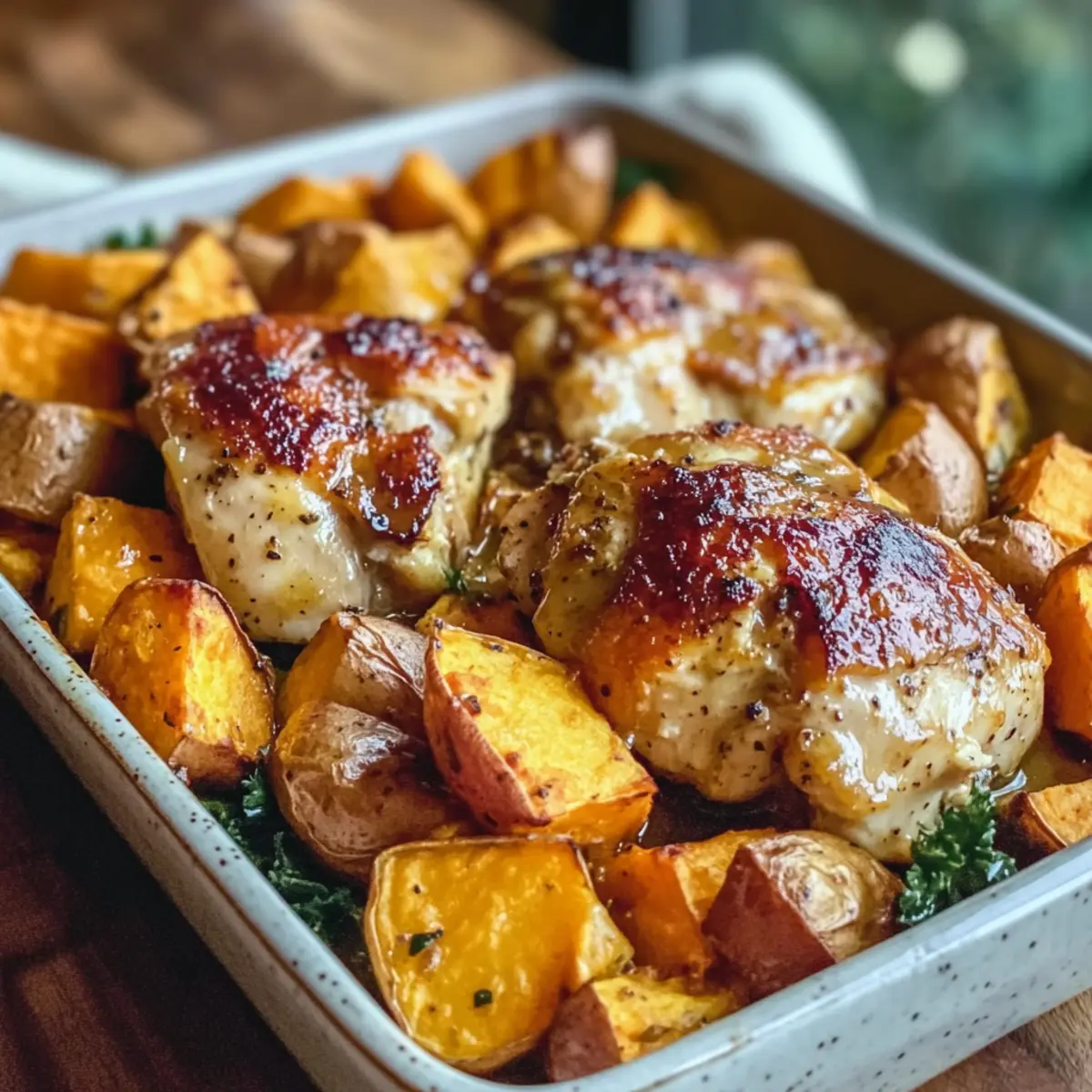 - Lege die Hähnchenschenkel und Süßkartoffeln auf ein Backblech.