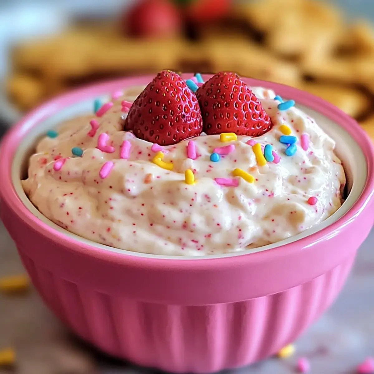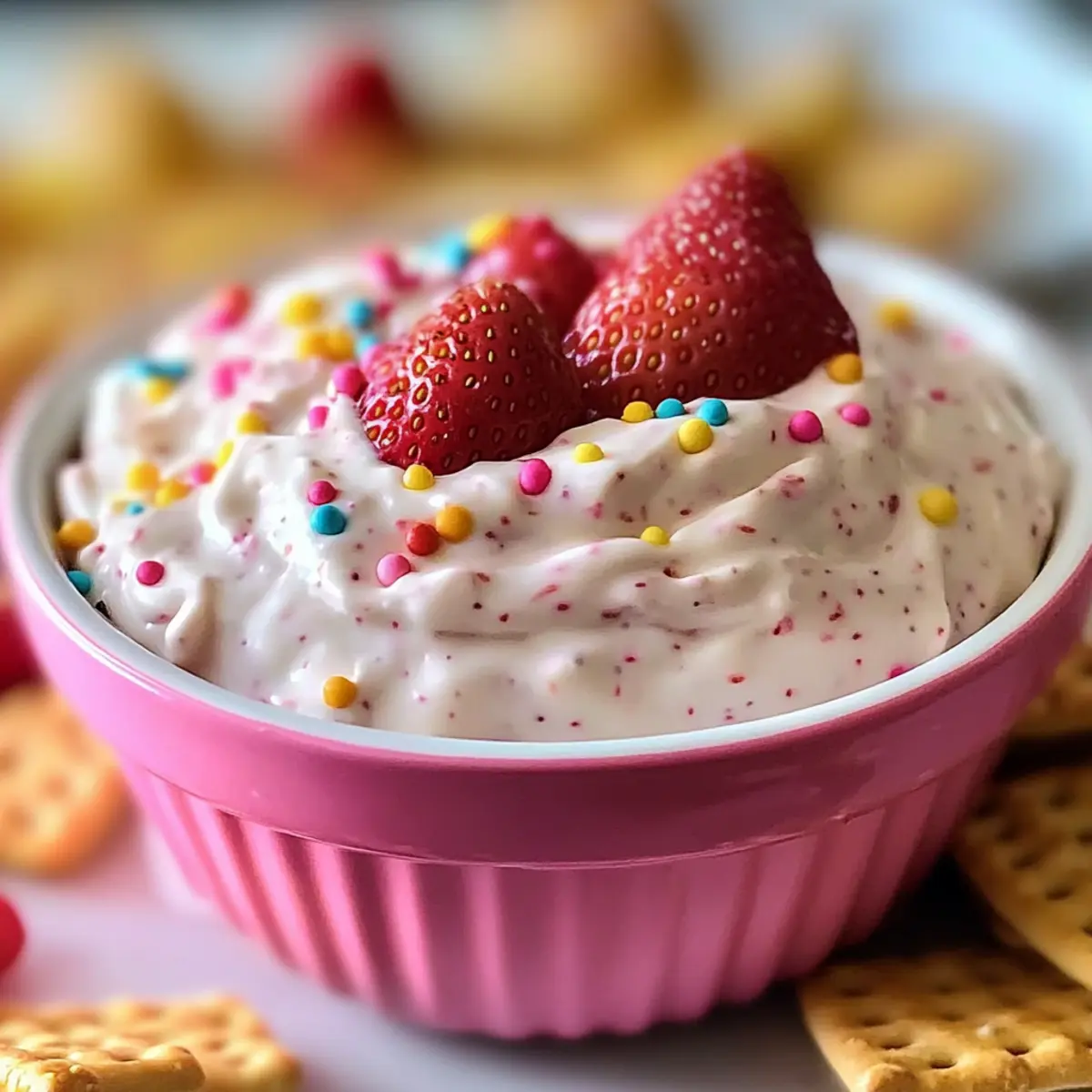 - Fülle den Dip in eine flache Servierschüssel und dekoriere mit Dippers wie graham crackers, frischen Erdbeeren oder salzigen Brezeln.