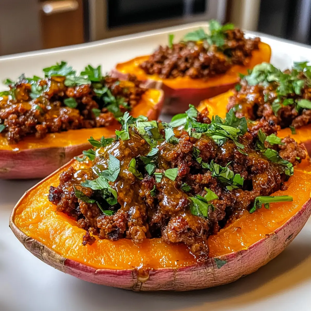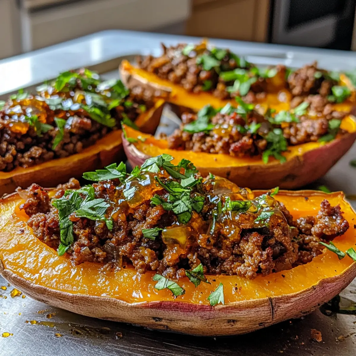 Scharfe Honig-Rinderhackfleisch- und Süßkartoffelboote