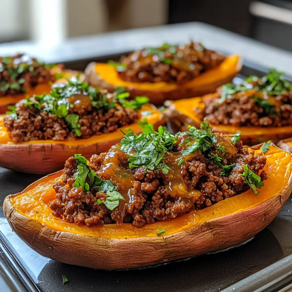 - Fülle die vorbereiteten Süßkartoffelboote mit der Mischung aus dem Rinderhackfleisch.