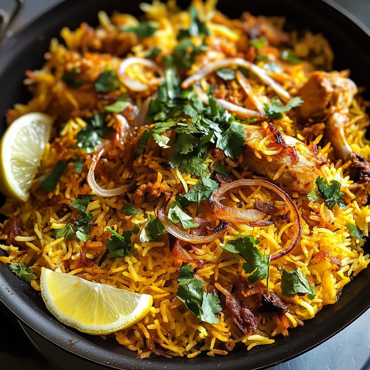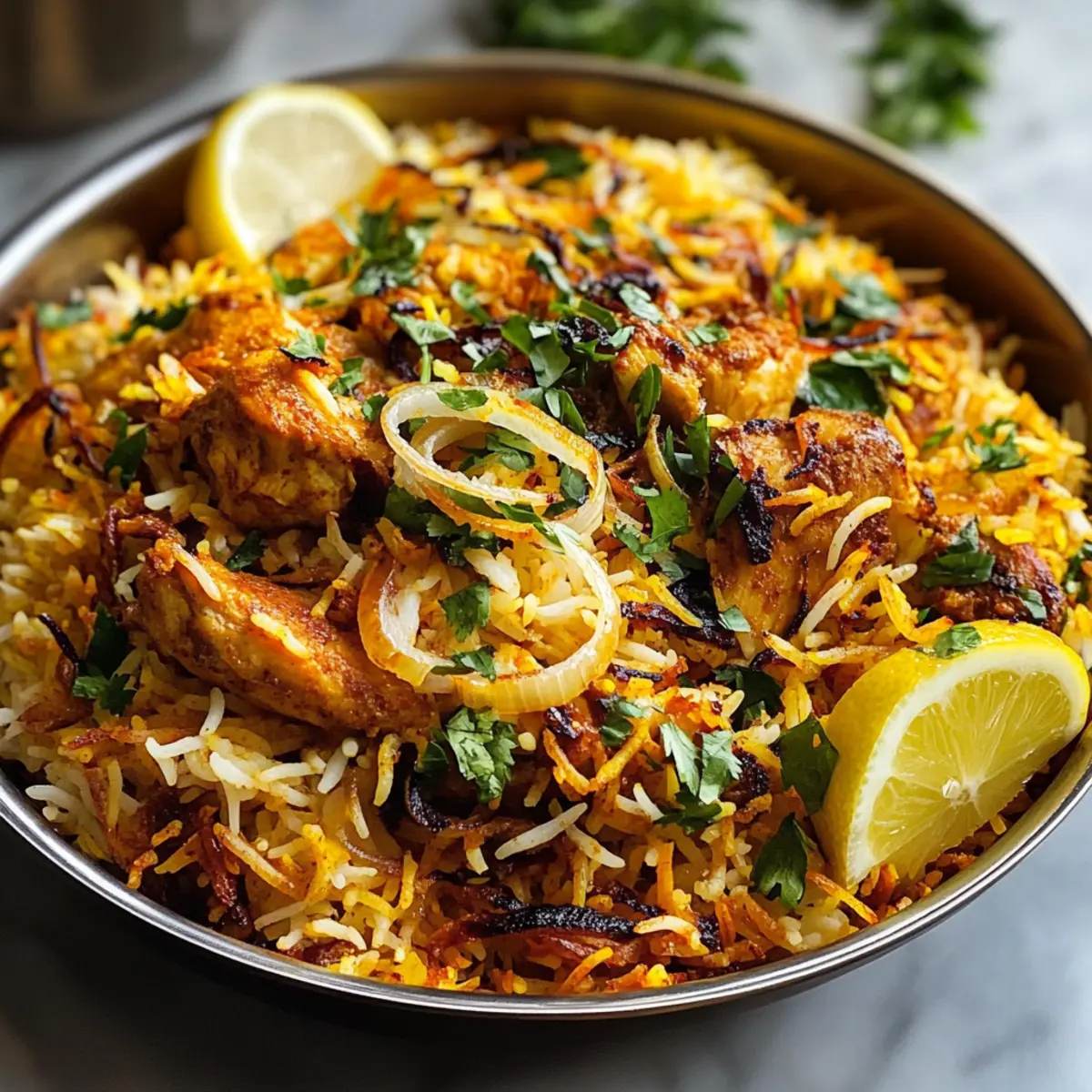 Sobald die Biryani fertig ist, nehme den Topf vom Herd und lasse ihr einige Minuten ruhen, bevor du sie servierst. Garnier die schichtige würzige Hähnchen-Biryani mit frittierten Zwiebeln, frischer Minze, Koriander und Zitronenscheiben für einen farbenfrohen und geschmackvollen Abschluss.