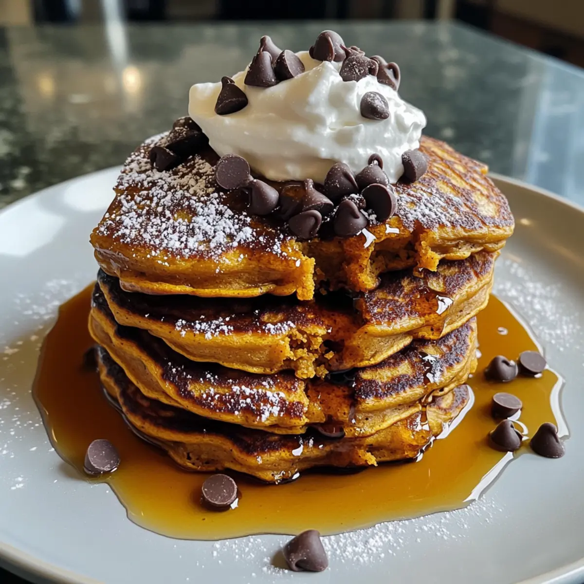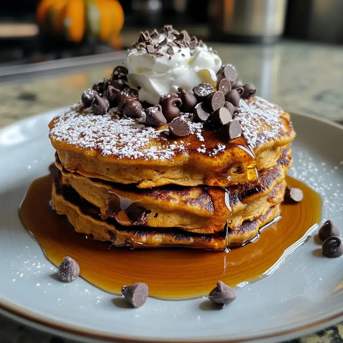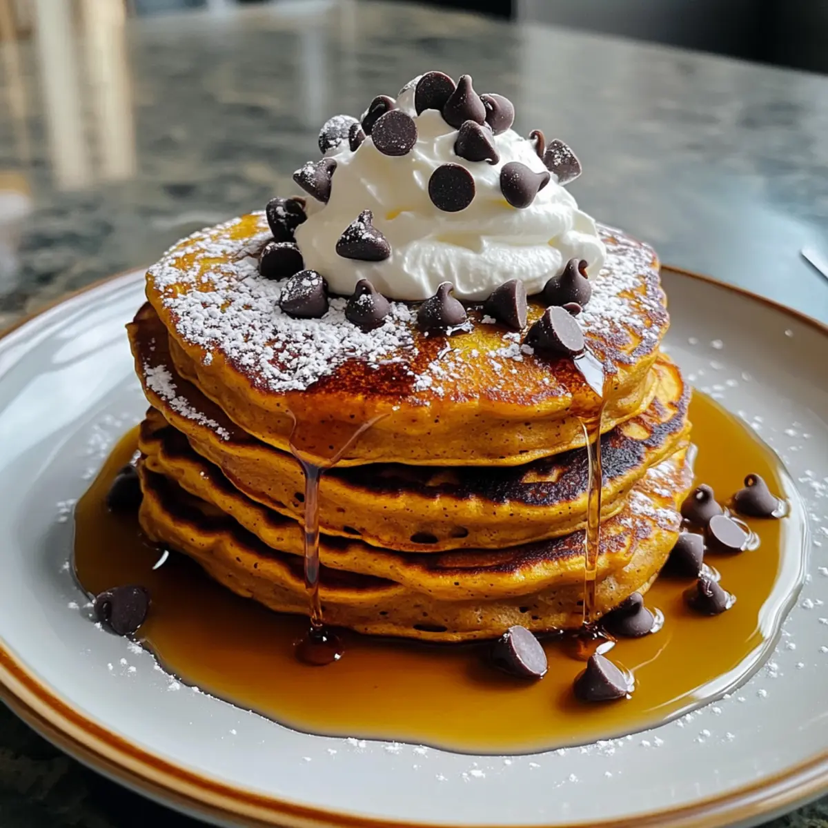 Herbstliches Flair: Diese Schokoladenstückchen Kürbis Pfannkuchen bringen die Aromen des Herbstes direkt auf euren Tisch und lassen euch jeden Bissen genießen.