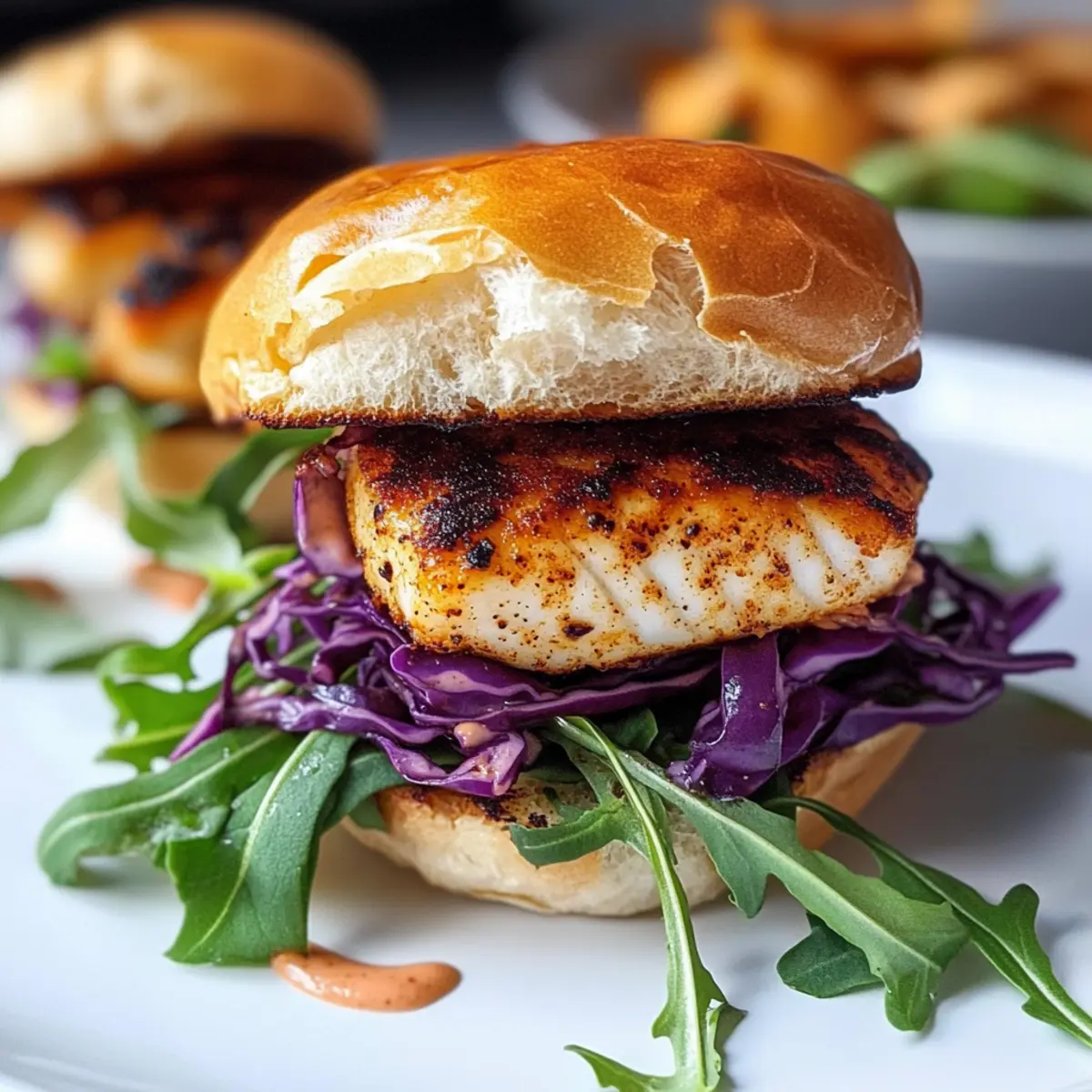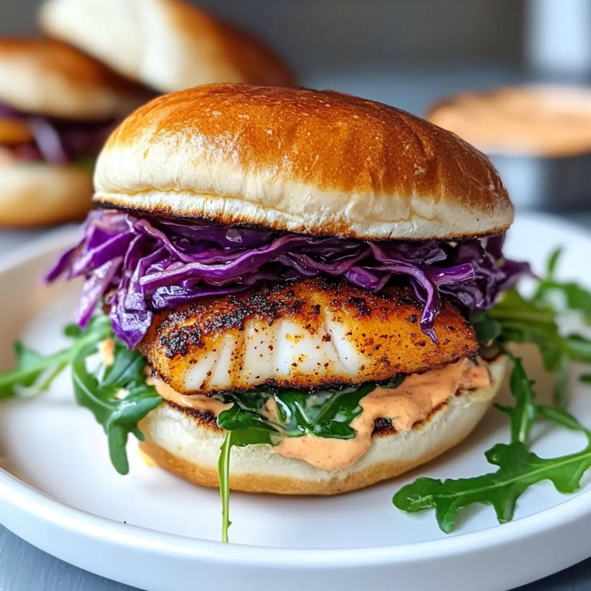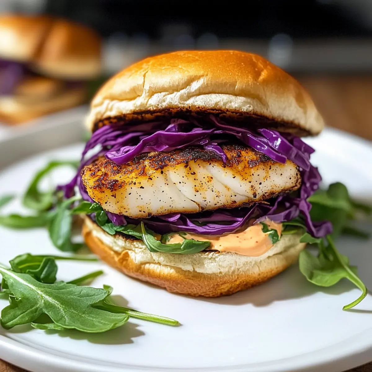 Schichte den gerösteten lila Kohl auf die Mayonnaise-beschmierte Brötchenhälfte, gefolgt vom gebratenen Fisch, den du vorsichtig von der Haut entfernst. Füge eine Handvoll frischen Rucola hinzu und bedecke das Ganze mit der anderen Brötchenhälfte. Dein schwarzer Fischburger mit Sriracha-Mayo ist jetzt bereit, serviert zu werden.