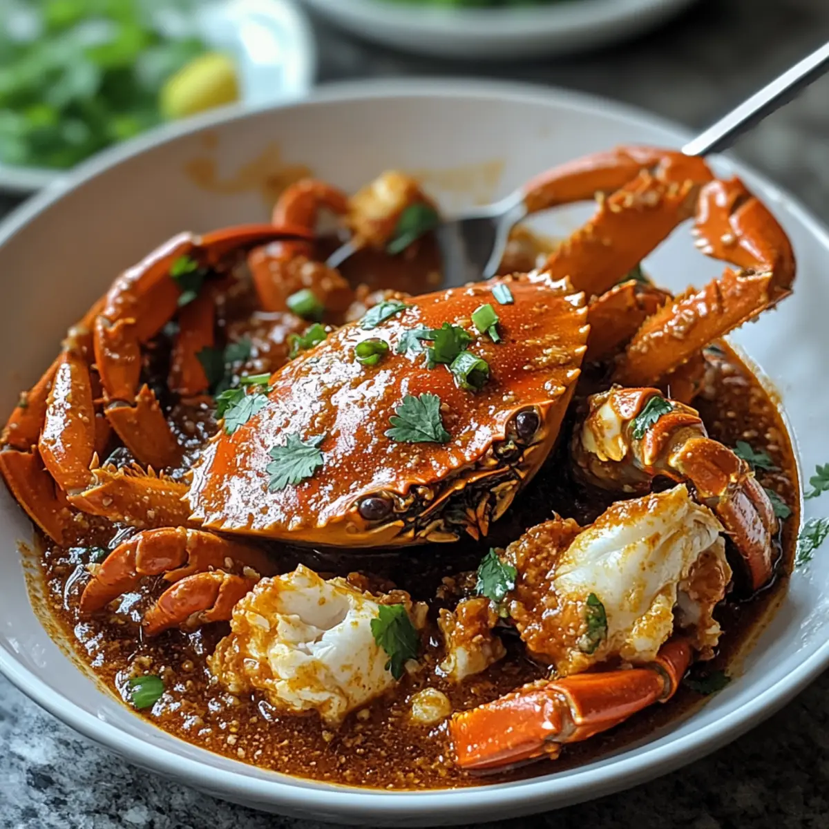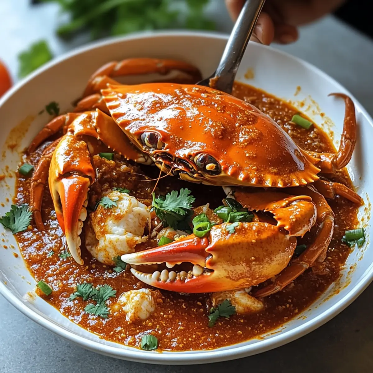 - Nimm die Pfanne vom Herd und garniere die Singapur Chili-Krabbe mit frischem Koriander und gehackten Frühlingszwiebeln.