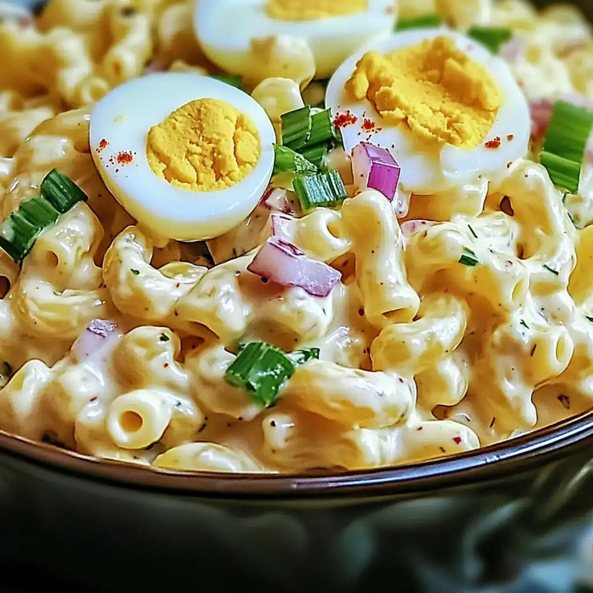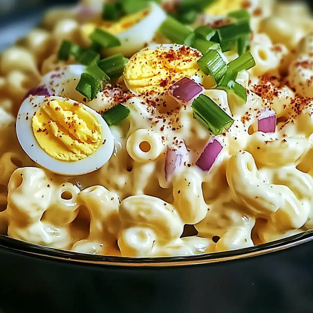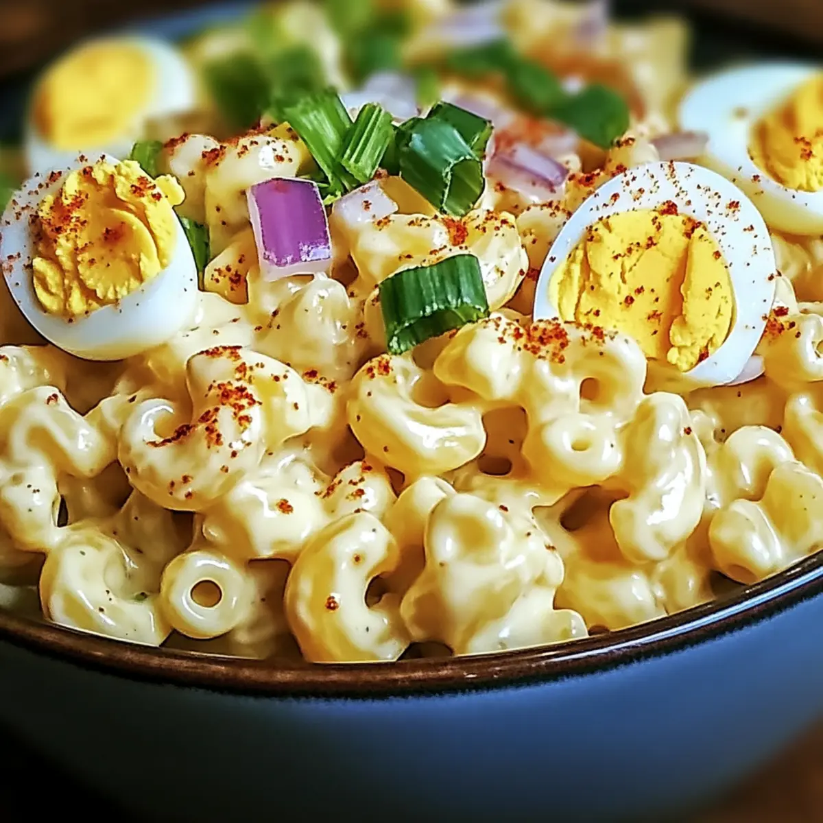 Vielfalt: Dieser Teufels-Ei-Makkaroni-Salat lässt sich ganz nach deinem Geschmack anpassen – füge knackiges Gemüse oder sogar knusprigen Speck hinzu!