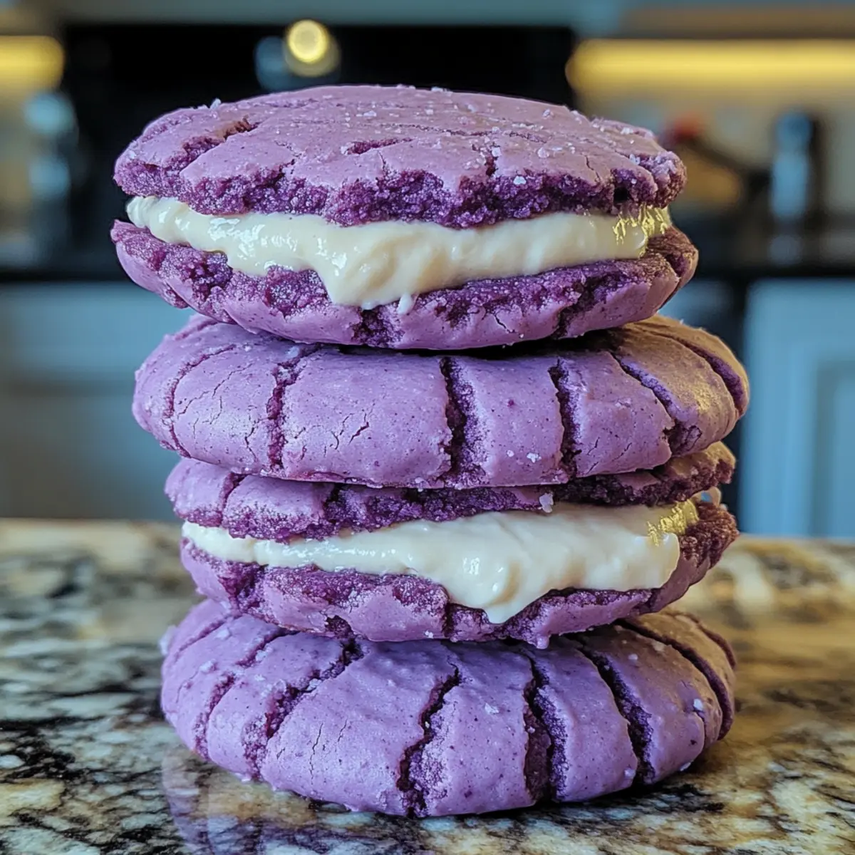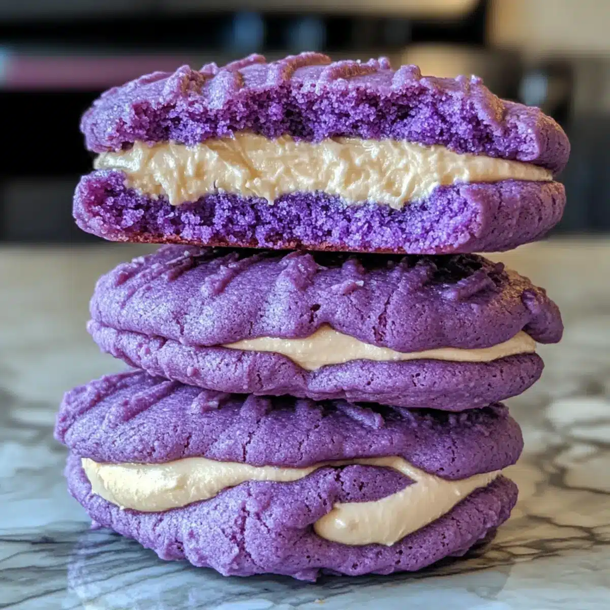 Genieße diese köstlichen Ube Krümel Sandwichkekse und lasse dich von ihrer Kombination aus Farben und Aromen begeistern!