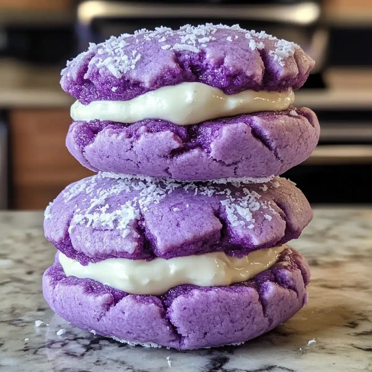 Ube Krümel Sandwichkekse mit cremiger Kokosnuss
