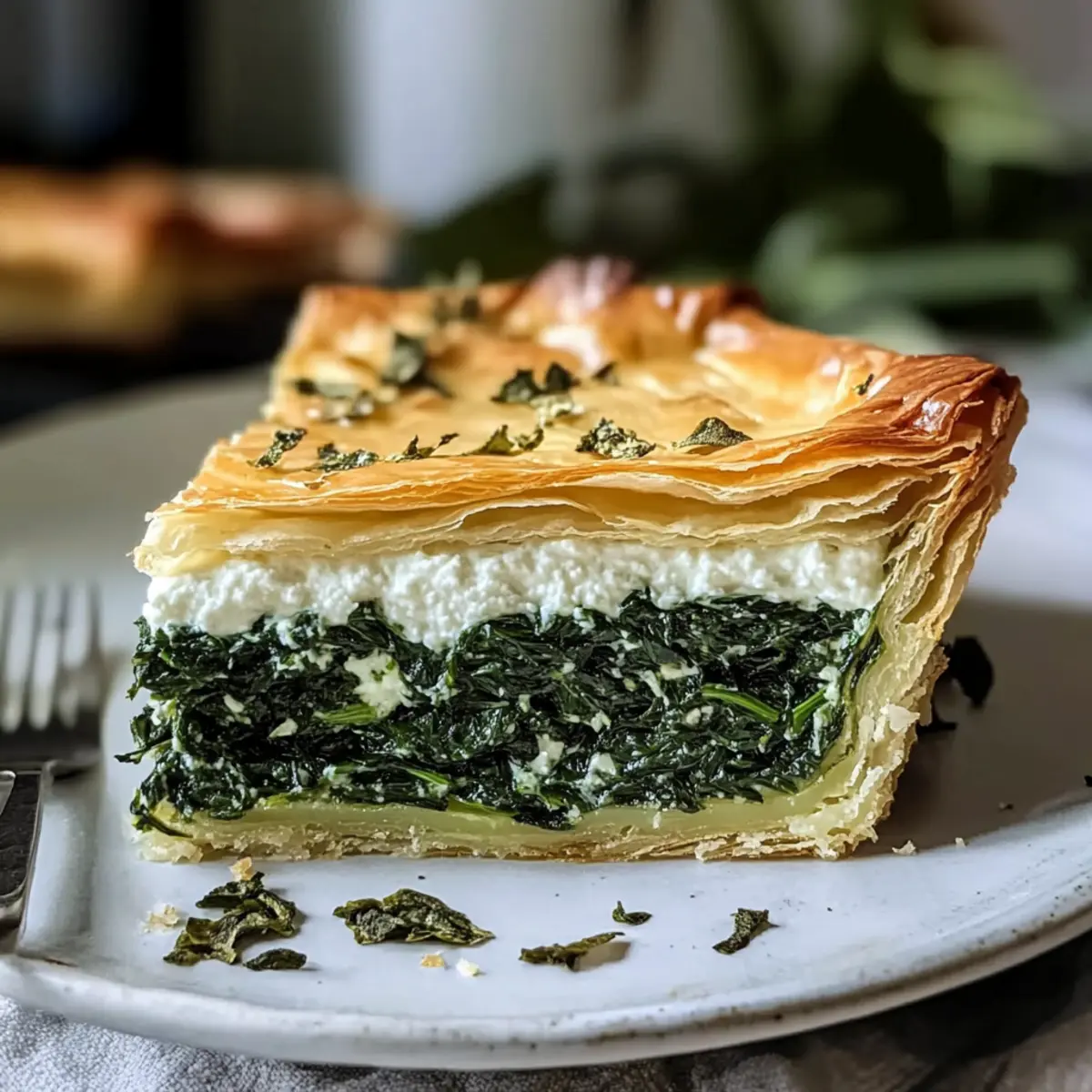 - Spinat- und Ricotta-Mischung gleichmäßig in die Form füllen und mit einer Schicht Blätterteig abdecken.