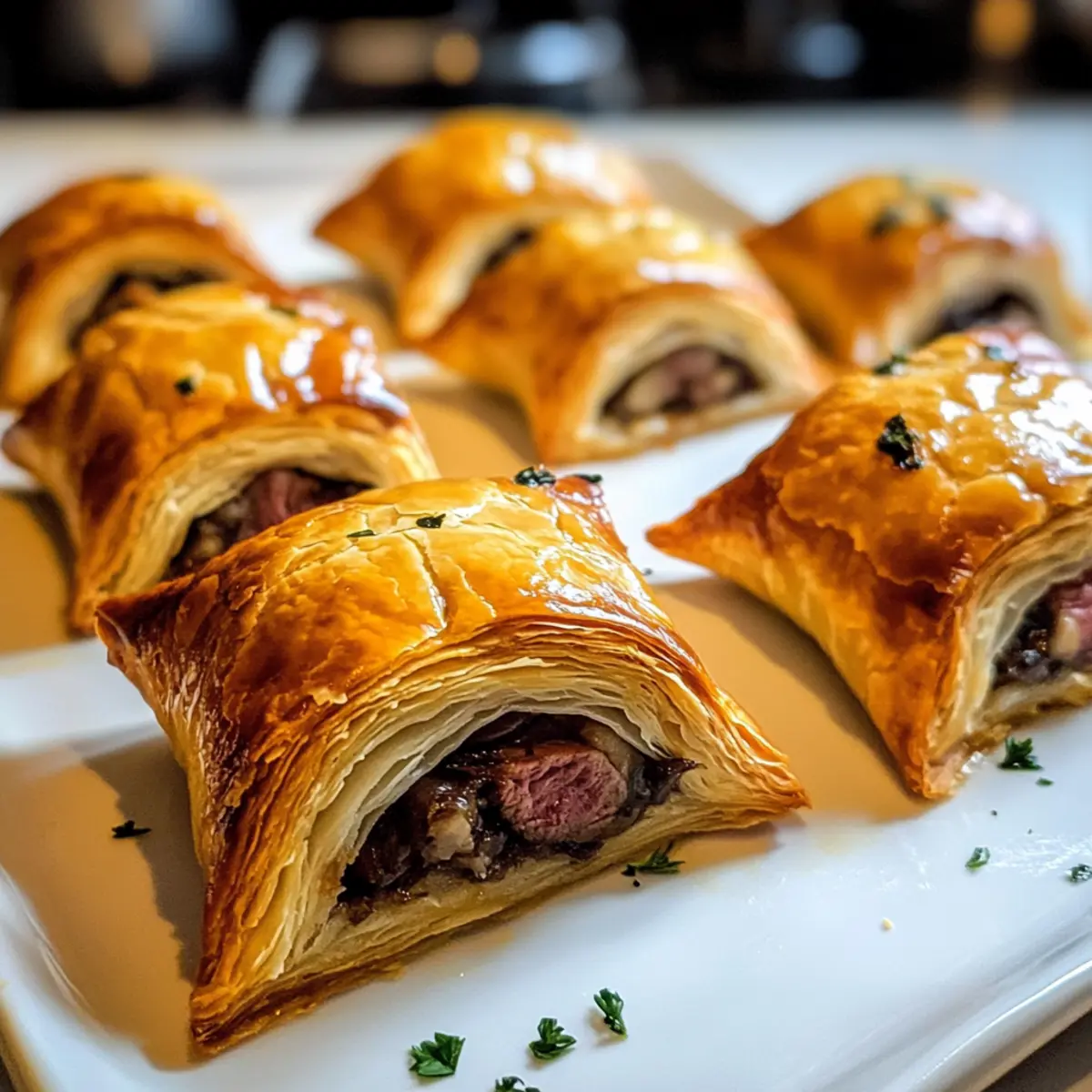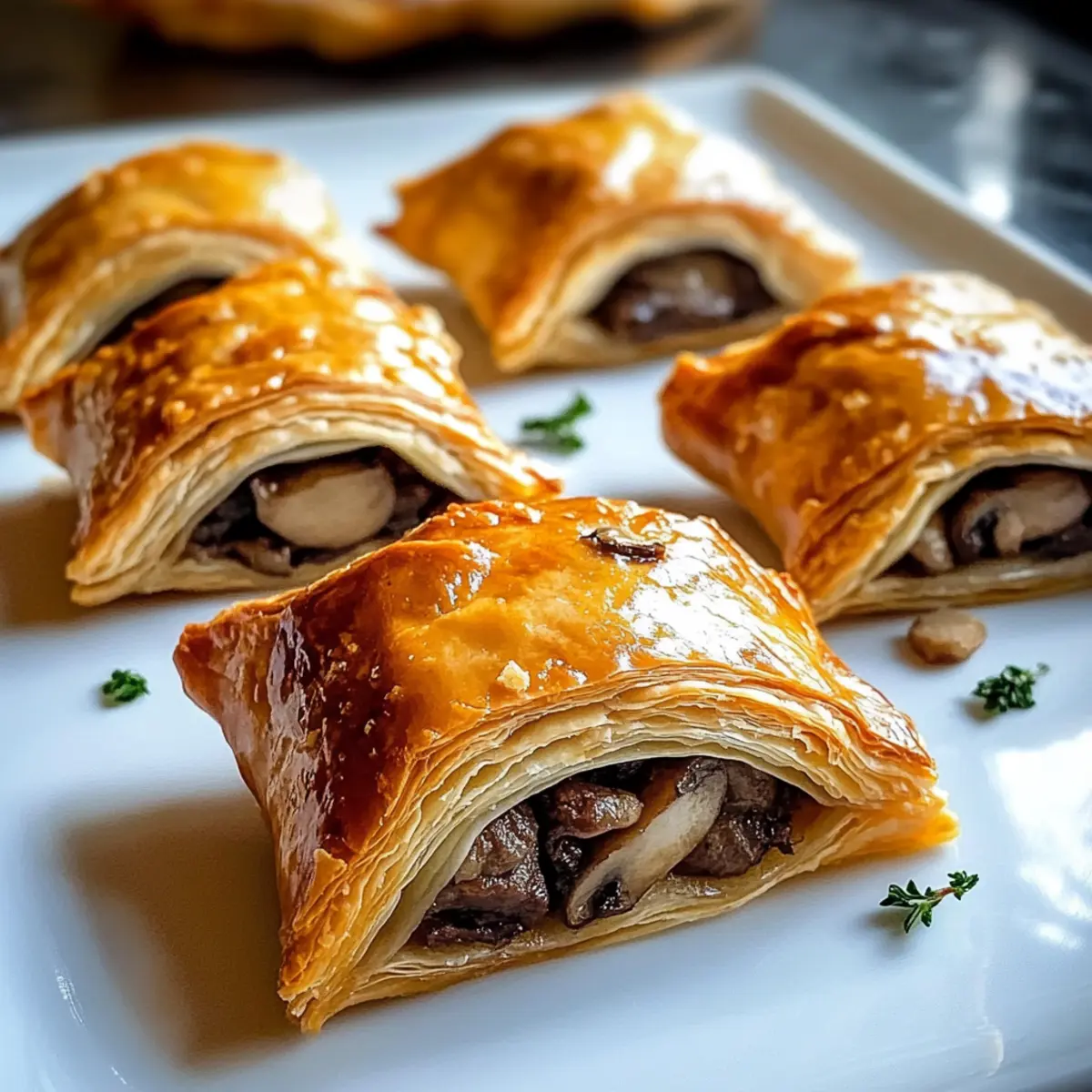 Aromatische Kombination: Diese Bissen vereinen zartes Rindfleisch und würzige Pilze in einem knusprigen Blätterteig, der jeden Biss zu einem Genuss macht.