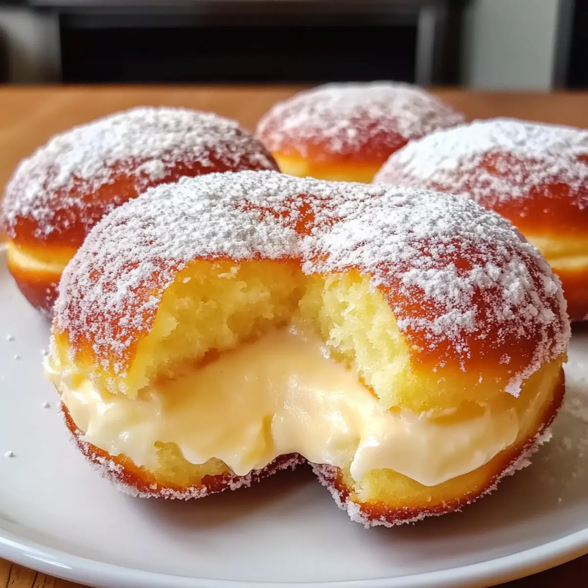 - Bestäube die Donuts großzügig mit Puderzucker und serviere sie frisch.