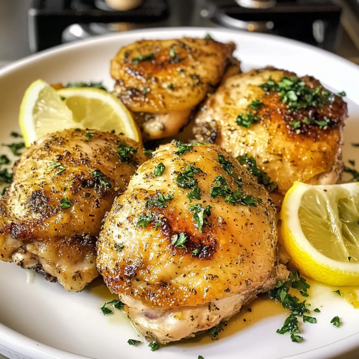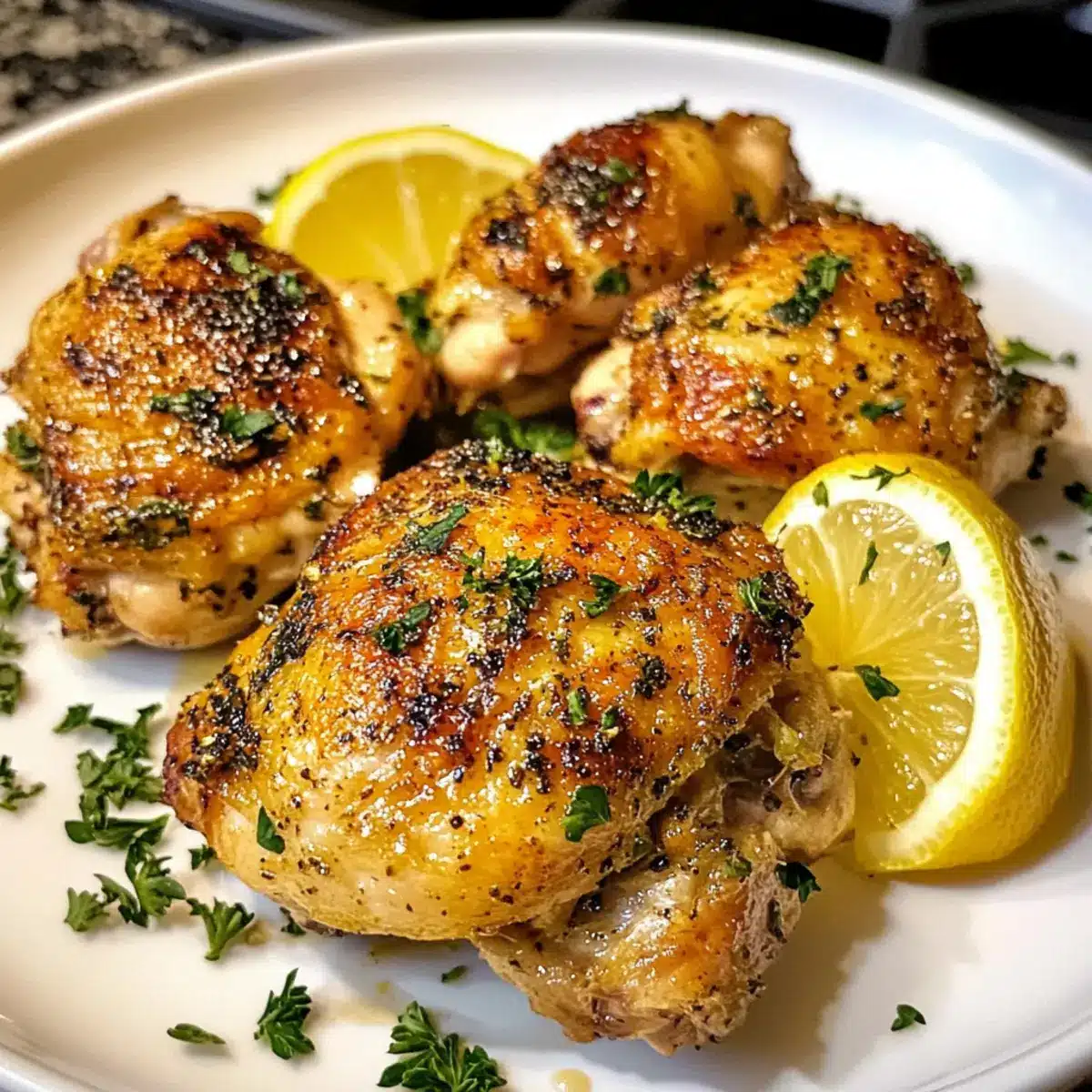- Nehme die Zitronen-Knoblauch-Hähnchenschenkel aus dem Ofen und lasse sie kurz ruhen. Garniere sie mit frischer, gehackter Petersilie.